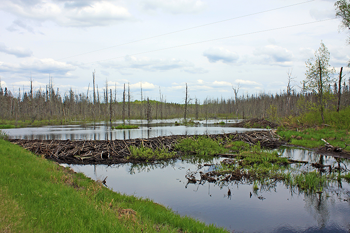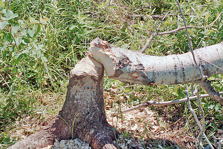 | Sign | Dams – A beaver will build a dam in a stream or river to slow the flow of water. Where sufficient stable water is available it will not build a dam but rather burrow into the bank. The front (downstream) side of a dam consists of large branches with the but ends facing downstream. Mud and debris make up the center of the dam. The back (upstream) side is made up of small branches. Lodges – A lodge is a large pile of branches covered with mud, debris, and aquatic vegetation. It can rise up to 10 feet above the pond floor. It is excavated from within. In the winter, vapor can often be seen rising from a thinly covered opening used for ventilation (smoke hole) at the top of the lodge. Lodges are usually built near or at the edges of lakes and ponds. Canals – A canal may be up to two feet wide and deep. It provides a safe water passage and can be used to help transport felled trees to the pond. Cut trees – After downing a tree or branch a beaver may completely strip the outer bark to get at the cambium. Tree stumps near pond edges may show ¼″ wide incisor marks. Scat – Beavers defecate in the water. |