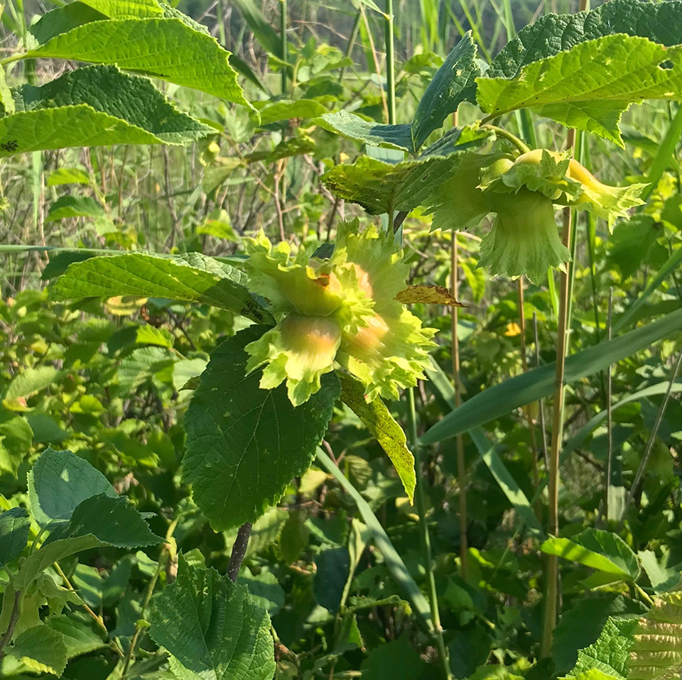 American hazelnut is a fast-growing, deciduous shrub rising on numerous stems from large, horizontal rhizomes usually 4 ″ to 6″ below the surface of the soil. It often forms a dense, rounded clump that can reach up to 30′ in diameter in favorable conditions. It sometimes forms thickets. The stems are slender, straight, and sparsely branched. They are usually 5′ to 10′ tall, but mature stems can reach up to 15′ in height and 1¼″ in diameter at breast height. Outer stems become arching and spreading with age. The bark on young stems is light grayish-brown, shiny, and smooth. On mature stems the bark is somewhat rough, sometimes with finely grooves or ridges. It is not shaggy or peeling. The branches are ascending. First-year twigs are slender and tan to dark brown. They are covered with long, spreading hairs that are red when young, whitish later; and with stalked glands (glandular hairs) that are visible without magnification. They are sticky to the touch. They sometimes become almost hairless near the end of the first season. Second-year twigs are zigzag and hairless. The buds are broadly egg-shaped, about to ⅛″ long and wide, brownish-gray, and unstalked. They are covered with 4 to 6 scales. The outer bud scales are not deciduous, remaining attached throughout the season. Winter buds are rounded, not angled, at the tip. Flower buds and leaf buds are similar in size and appearance. Leaf scars are small and flat or slightly raised, not depressed. They have 3 bundle scars. The leaves are alternate, broadly egg-shaped to broadly elliptic or broadly inversely egg-shaped, 2⅜″ to 4¾″ long, and 1⅜″ to 3⅛″ wide. They are attached to the twigs by ¼″ to ¾″ long leaf stalks. The leaf stalk is covered with long, spreading hairs that are red when young, whitish later, and with glandular hairs that are visible without magnification. It is not sticky or resinous. The leaf blade tapers to a sharp point at the tip and is heart-shaped or rounded at the base. It often has straight sides, giving it a squarish appearance, and is occasionally slightly lobed near the tip. There are 6 to 9 lateral veins on each side of the midrib. The lateral veins are sometimes branched. The upper blade surface is dark green and sparsely hairy. The lower surface is paler green, felty to the touch, and covered with soft, spreading hairs, especially along the larger veins. The margin is irregularly doubly toothed with sharp, forward-pointing teeth. In the fall the leaves turn yellow to orange. Male and female flowers are borne on the same branch. Male flowers appear in late summer singly or in pairs, sometimes in clusters of 3. They are green, slender, cylindrical, drooping clusters of many flowers (catkins). They droop from the leaf axils of twigs of the previous year on woody, ⅛″ to ⅜″ long stalks. They turn brown in the winter. In the early spring they become yellowish and elongate, becoming 1″ to 2¾″ long. The longer male catkins are at least 1½″ long. They shed their pollen in late March to early May. Female flowers are much smaller, compact, reddish-brown catkins that resemble leaf buds. They are concealed by overlapping scales with only the elongated, bright red stigma and styles exposed. They are subtended by a minute bract and a pair of bractlets. The bractlets get much larger with age, becoming the husk of the fruit. The fruits appear singly or in clusters of usually 2 or 3, sometimes 4 or 5. Each fruit is an edible nut enclosed in a leaf-like husk with a short, broad fringe at the end. The husk is ¾″ to 1⅜″ long, ⅝″ to 1 3 ⁄16″ wide, extending 3 ⁄16″ to ¾″ beyond the nut. It is no more than 2 times as long as the fruit. The fruit is sometimes visible. The husk is covered with both glandular hairs and soft, nonglandular hairs. The nut is more or less globe-shaped and ⅜″ to ⅝″ in diameter. It is enclosed in a hard shell. The fruit matures in late August to late September. |