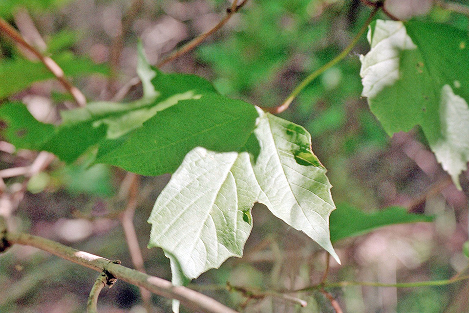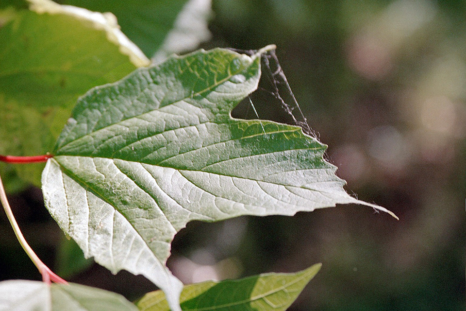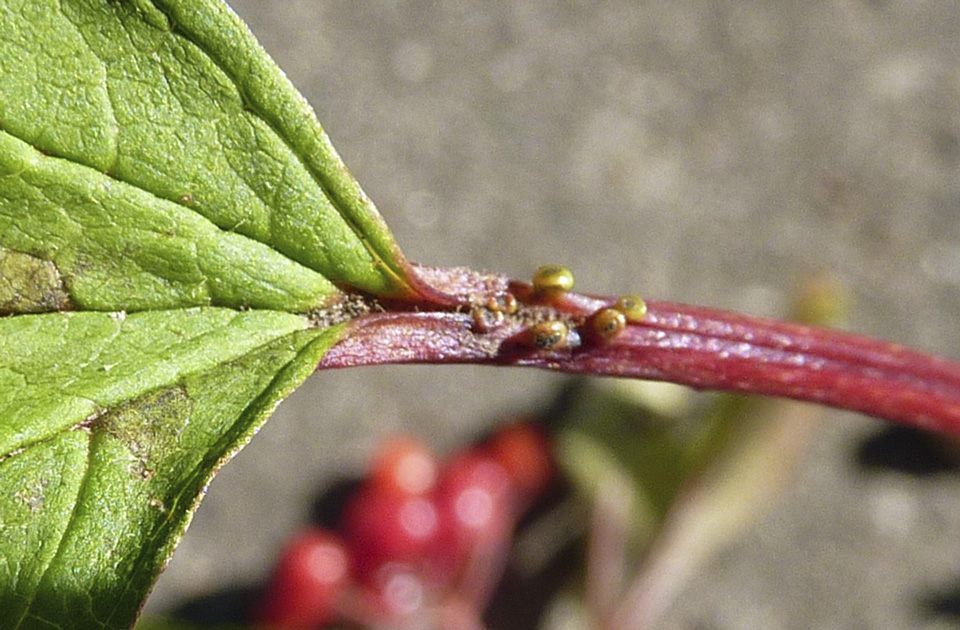 European cranberrybush (Viburnum opulus var. opulus) leaf petioles have up to 8 projecting glands. The glands are larger, elliptical in cross section, and indented (concave) on the top with a conspicuous ear-like rim. The channel on the petiole is hairless of has scattered, short, fine hairs. The leaves are smaller, no more than 3⅛″ long and wide. The leaf margins are coarsely toothed. The drupes are bitter. |