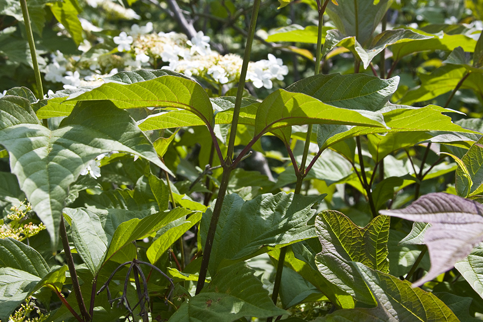 American highbush cranberry is a relatively fast-growing, short-lived, tall shrub. It can be up to 16′ tall and up to 2⅜″ in diameter at breast height, but is usually no more than 12′ in height. It rises on multiple stems from scattered, deep, anchoring roots and shallow, spreading, fibrous, soil-binding roots. Shrubs reproduce vegetatively by layering or tip rooting. In layering, shrubs produce stems that lie on the ground with only the tips ascending (decumbent). A decumbent stem roots at a node, produces an aerial stem, and eventually detaches, forming a new plant. In addition, lower branches may droop to the ground, root at the tip, and send up a new shoot. Vegetative reproduction occasionally results in a thicket. The stems are upright, slightly spreading, or sometimes arching. Twigs are moderately stout. First year twigs are green to reddish-green and hairless, with white, conspicuously raised bumps (lenticels). Second-year twigs are yellowish-brown to grayish-brown, round in cross section, and hairless, with widely scattered, small, round lenticels. The pith is white and solid. The leaf scars are narrow, crescent-shaped, and slightly raised. Each leaf scar has three bundle scars. The terminal bud is stalked, greenish-red, mostly hairless, short, plump, oblong egg-shaped, and somewhat flattened. It is not sticky. It is covered by two scales that are fused into a tube at the base and for part of their length, free and overlapping toward the tip. Lateral buds are about half as long and globe-shaped to egg-shaped. The bark is gray or grayish-brown, relatively smooth, and not peeling. On older stems the bark occasionally becomes somewhat fissured. The leaves are opposite, undivided (simple), and deciduous. They are attached to the twig on a ¾″ to 1⅜″ long leaf stalk (petiole). The petiole is green or greenish-red and channeled on the upper (ventral) side. The channel has relatively long, coarse hairs, at least where the blade is attached. The petiole is otherwise hairless. It is not winged. There are 2 or 4 projecting, 1 ⁄64″ to 1 ⁄32″ in diameter glands near the attachment of the leaf blade. The glands are slender, circular in cross section, and flat or rounded (convex) on the top. There is a pair of leaf-like, smooth, 1 ⁄32″ to 3 ⁄16″ in long appendages (stipules) at the base of the petiole. The stipules are deciduous and fall off early in the season. The glands may disappear or become deformed late in the season. The leaf blades are relatively thin, papery (firm), broadly egg-shaped in outline, shallowly to moderately 3-lobed, 2″ to 4¾″ long, and 2⅜″ to 4⅜″ wide. They are broadly rounded, broadly tapered, or nearly squared off at the base. The lobes are angled or short-tapered to a sharply-pointed tip. The leaf blades are palmately veined with three main veins, each one extending from the petiole at the base of the blade to the tip of one of the lobes. Each main vein has several pinnate secondary veins. The secondary veins are straight or slightly arched, and most reach the margin and end in a tooth. The veins are depressed on the upper surface of the blade, raised on the lower surface. The upper surface is dark green, has a slightly wrinkled appearance, and is sparsely hairy or almost hairless. The lower surface is pale green and sparsely hairy or moderately to densely hairy along the main veins. The margins may be untoothed or sparingly toothed. Leaves near the branch tips are often narrow and unlobed. The leaves turn yellow, orange, red or dark reddish-purple in the fall. The inflorescence is a dense, rounded, flat-topped, 2⅜″ to 5″ in diameter, branched cluster (cyme). It is borne on a ⅝″ to 2″ long stalk (peduncle) at the end of a four-leaved shoot that rises from a lateral bud at the end of a second-year twig. The cymes have 6 to 8 main branches emanating from the tip of the shoot. Each cyme has 100 or more small fertile flowers and an outer ring or 5 to 10 much larger sterile flowers. The fertile flowers are ⅛″ to ¼″ in diameter. There are five sepals, five petals, five stamens, and one style. The sepals are green, fused for most of their length into a minute cup (calyx), and separated at the tip into five minute, egg-shaped lobes. The petals are pale yellow to creamy white, egg-shaped to elliptical, and 1 ⁄16″ to ⅛″ long. The stamens have white filaments and bright yellow anthers. They are 1 ⁄16″ to ⅛″ long, longer than the petals. The style is thick, short, light green, and tipped with a three-lobed stigma. The sterile flowers on the margin are flat and ½″ to 1 3 ⁄16″ in diameter. The flowers have an unpleasant scent. They appear in late May to late June after the leaves. The fruit arrangement (infructescence) is a heavy, drooping cluster. Each fruit is an edible, juicy, cranberry-like, ellipse-shaped to nearly spherical, ¼″ to ½″ in diameter drupe. It contains one seed. It is green initially, turning yellowish as it matures, eventually becoming translucent orange or bright red when ripe. The calyx and stigma persist in fruit, forming a dried tip at the end (apex) of the drupe. The peduncles turn red as the fruit matures. The fruit ripens in early August to early September, often remaining on the plant through the winter. |