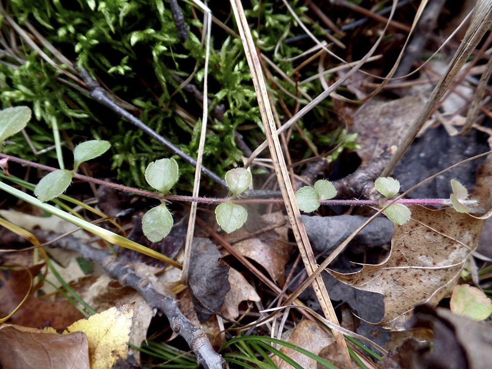 Twinflower is a perennial, ground-hugging, evergreen, dwarf shrub (subshrub). It occurs throughout Canada. In the United States it occurs in the east from Maine south to New York and west to Minnesota, and in the west from Washington east to Montana and south to northern California. In Minnesota it is very common in the northeast and north-central regions, uncommon in the metro and southeast regions, and absent from the south and southwest regions. There are a few occurrences in the north-western counties and only a single occurrence in Fillmore County along the South Branch Root River. Twinflower sometimes forms large colonies. It is found in deciduous, coniferous, and mixed forests and woodlands, thickets, cedar swamps, and bogs, in moist or moderately moist conditions. It grows under partial shade in peat, on rotting logs, and on mossy boulders. The stems are slender, 3′ to 6′ (1 to 2 m) long, and lie flat on the ground (prostrate). They are slightly woody, reddish-brown, and covered with short, fine hairs. Older stems are woody and 1⁄16″to ⅛″ (2 to 4 mm) in diameter. Every few inches a branch rises from a node. Branches can be 2″ to 6″ tall but are usually no more than 4″ in height. They are erect, slender, reddish-brown, leafy, and hairy. New roots are produced where a node touches the ground or other substrate. After many years the stem may separate there and a new plant is created. The leaves are opposite, evergreen, somewhat leathery, ⅜″ to 11⁄16″ (9 to 18 mm) long, and ¼″ to ⅝″ (7 to 15 mm) wide. They are on 1⁄16″ to 3⁄16″ (2 to 5 mm) long leaf stalks. The leaf blades are egg-shaped (widest below the middle), inversely egg-shaped (widest above the middle), or elliptical (widest at the middle), to almost circular. They are angled at the base and rounded at the tip. The upper surface is dark green and sparsely covered with fine hairs. The lower surface is pale green and hairless or almost hairless. The margins have 1 to 4 rounded teeth above the middle on each side. Smaller leaves are often untoothed. The inflorescence is a pair of flowers at the end of an erect, 1⅜″ to 3⅛″ (3.5 to 8 cm) long, inflorescence stalk (peduncle). Each flower droops at the end of a short, less than ⅜″ long, flower stalk (pedicel). The peduncle and pedicel are covered with gland-tipped hairs. There is a small modified leave (bract) at the base of each pedicel. Each flower is bell-shaped and 5⁄16″ to ½″ (8 to 12 mm) long. There are 5 outer floral leaves (sepals), 5 petals, 4 stamens, and 1 style. The ovary, at the base of each flower, has two pairs of modified leaves, an outer, large, shield-like pair, and an inner, minute pair. The ovary and outer bracts are covered with gland-tipped hairs. The sepals (together the calyx) are green, united at the base into a short tube then separated into 5, narrow, 1⁄16″to ⅛″ (2 to 3 mm) long lobes. The sepals are covered with gland-tipped hairs. They fall off when the plant is in fruit. The petals (together the corolla) are pink at the base, white at the tip. They are united at the base for more than half of their length into a funnel-shaped tube then separated into 5 pointed lobes. The inner surface of the corolla is densely covered with long hairs. The outer surface is hairless. The stamens are short and do not protrude from the corolla tube. The style has a slender white stalk and a cap-like stigma. It protrudes beyond the corolla tube. The fruit is a yellow, dry, globe-shaped, 1⁄16″ (2 mm) in diameter capsule with 1 seed. The fruit droops at the end of the pedicel and is enclosed by the persistent outer bracts. |