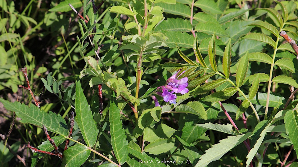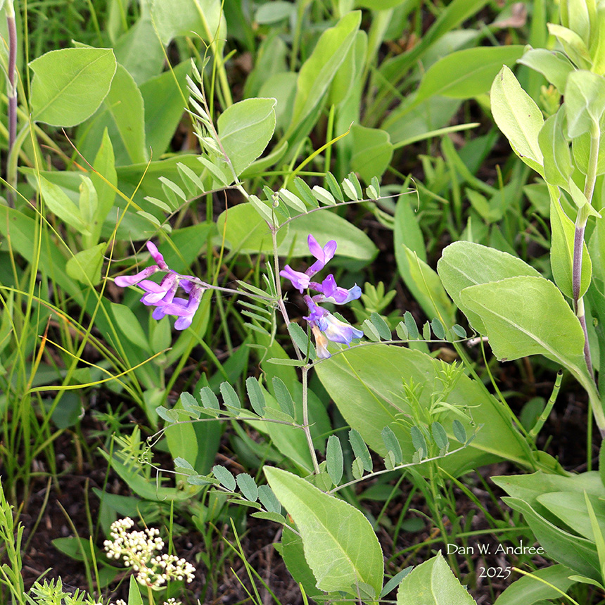 American vetch is a trailing or climbing perennial forb. The stems recline on the ground. They extend 16″ to 40″. They are hairless and often zigzagged. The leaves are alternate and pinnately divided into 4 to 8 pairs of leaflets. Each leaf has a tendril in place of a terminal leaflet and an even total number of leaflets. The tendril has several branches. There are a pair of conspicuous, leaf-like stipules at the base of each leaf stalk. The stipules are sharply toothed, about ⅛″ long, and about 7 ⁄16″ wide. The leaflets are egg-shaped or elliptic, ⅜″ to 1″ long, and 3 ⁄16″ to ½″ wide. They are thin, not stiff. The leaf tips are blunt or broadly rounded and tipped with a short, sharp, abrupt point. There are numerous lateral veins leaving the midrib at an angle of about 45°, branching, and then rejoining and forming an intertwining network before reaching the margin. The upper and lower surfaces of the leaflet blade are hairless or sparsely covered with appressed hairs. The margins are untoothed. The inflorescence is a loose, unbranched cluster (raceme) of 2 to 9 short-stalked flowers. The raceme is uncrowded and more or less one-sided. It is on a stalk rising from a leaf axil. The stalk is shorter than the subtending leaf. The flowers are ⅝″ to 1 1 ⁄16″ long. There are 5 sepals fused for most of their length into a hairy, ¼″ to 5 ⁄16″ long, cylinder-shaped calyx tube. The 5 petals are purple to blue and form a butterfly-like corolla, typical of plants in the Pea family. They are organized into a banner petal at the top, two lateral wing petals, and between the wings two petals fused into a keel. The banner is notched at the tip. The fruit is a pod, about 1″ long, containing 8 to 14 seeds. |