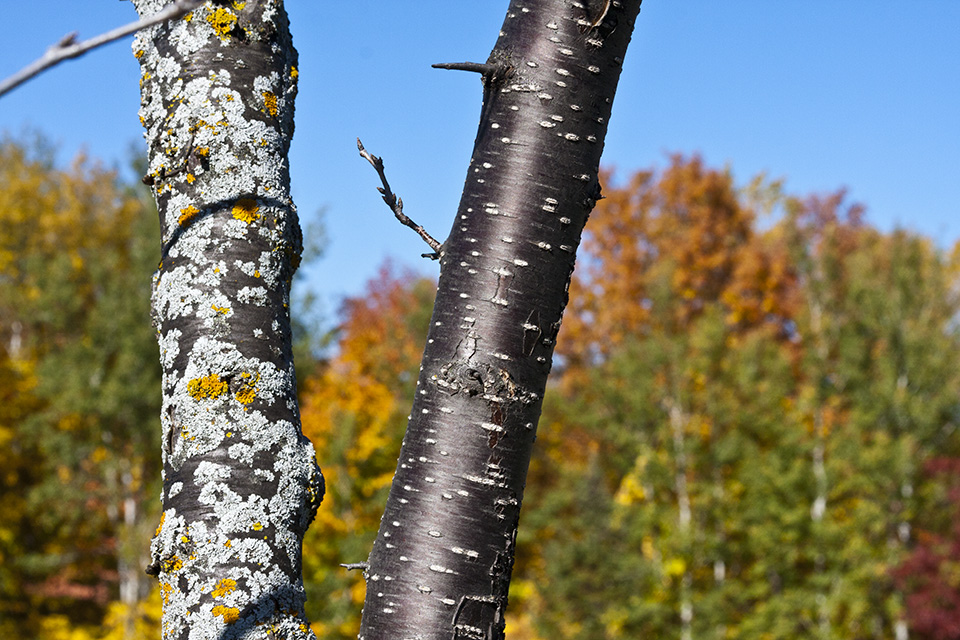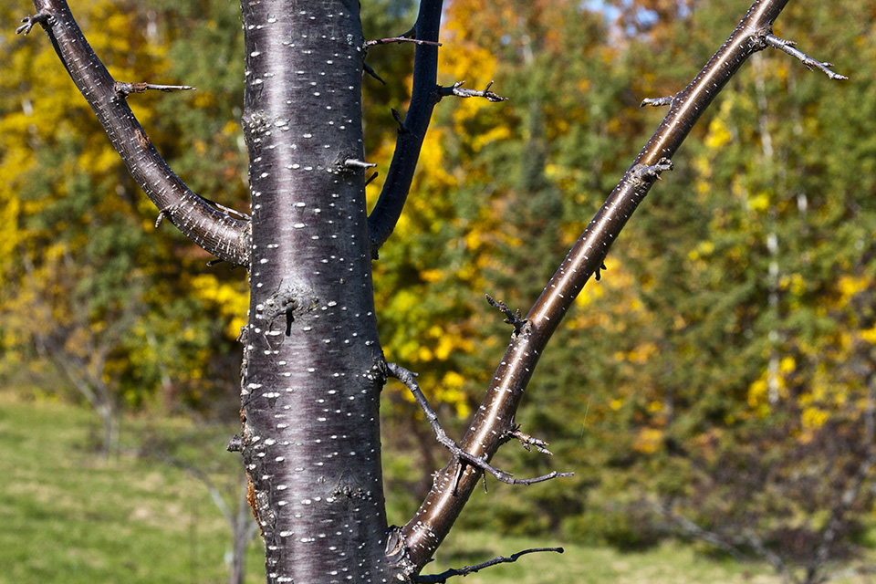 Canada plum is a shrub or small tree. There is a pair of red glands near the top of each leaf stalk. The leaf margins are bluntly toothed. Each tooth has a dark gland embedded at the tip. It has fruit 1″ to 1¼″ long with a red to yellowish-red skin. |