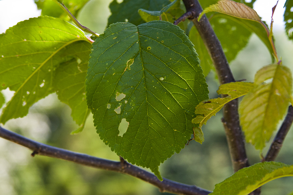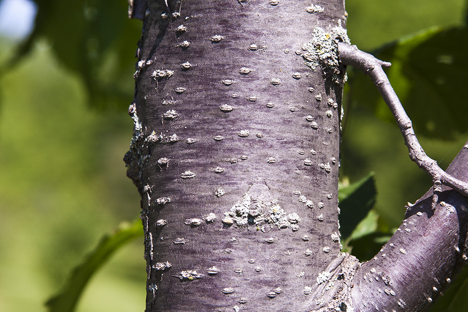 | American plum (Prunus americana) leaf stalks usually do not have a pair of glands near the top. The leaves are narrower, less round. The teeth on the leaf margins are sharp and do not have embedded glands at the tip. It has smaller fruit, ¾″ to 1″ long, with red skin. | ||