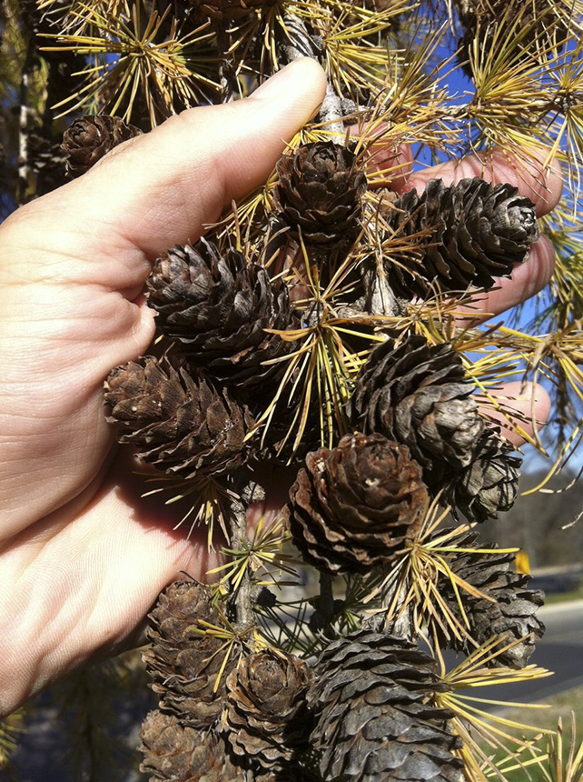 Tamarack (Larix laricina) is a small tree. Needles are borne singly or in clusters of 12 to 30. The twigs are pale orangish-brown. Mature seed cones are ⅜″ to ¾″ long and are covered with 10 to 30, but usually 12 to 15, scales. It is very common in Minnesota. |