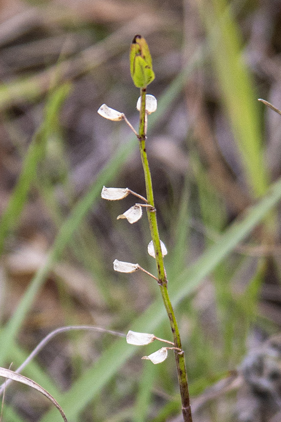 Location: Frenchman’s Bluff SNA This is an approximate actual size of this small low to the ground flowering plant I had never seen before. It almost looks like it has clam shaped attachments also growing on it. It was so small maybe 4-6 inches in height easy to not notice. It almost looks like those clam shaped parts of the plant are like a tiny fly or insect trapping plant but it is probably something else maybe how it seeds or something. I have no clue. |