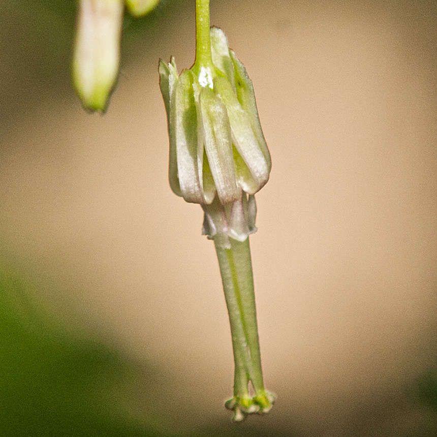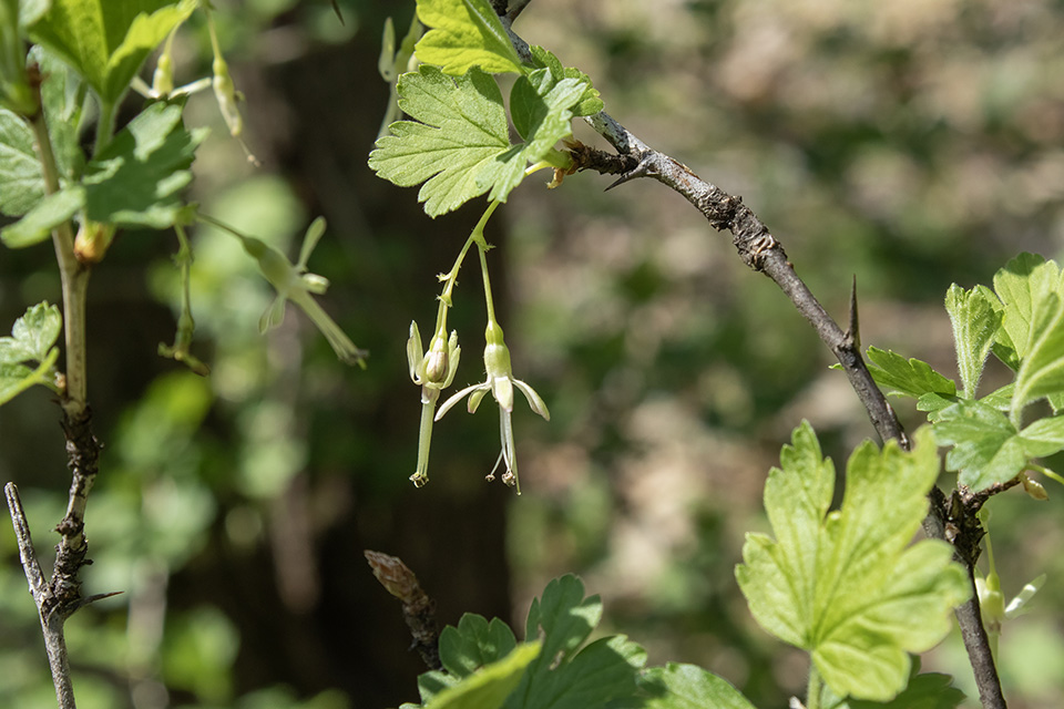 Missouri gooseberry is an erect shrub that rises on multiple stems from a branching, woody root system. The stems are ascending, arching, or prostrate on the ground and creeping (trailing), occasionally branching, and 24″ to 80″ long. Long stems may arch to the ground and root at the tip, forming a crown that sends up new stems. Other stems may be trailing and may root at the nodes. First year stems are green and hairy. They become grayish or whitish and hairless by the third year. The stems and branches have 1 to 3 well developed, straight, stout, ¼″ to 11 ⁄16″ long, reddish-brown spines just below the nodes, though these are sometimes absent. The stems also have straight, strong, slender, up to ¼″ long, brown bristles between the nodes. The branches have fewer bristles or no bristles between the nodes, especially near the top of the plant. The bristles are abundant on the lower ½ or ⅓ of the stem and on the larger branches, but are absent from the upper stem and smaller branches. The leaves are alternate and occur singly or in small clusters (fascicles) of 2 or 3. They are circular in outline, ⅝″ to 1 9 ⁄16″ long, and ¾″ to 1¾″ wide, and are on hairy, ¼″ to ¾″ long leaf stalks. The leaf blades are palmately divided into 3 or 5 lobes. The lobes may be further divided into 3 or 5 shallow secondary lobes. The base is usually tapered, rounded, or shallowly heart-shaped, sometimes squared off. The upper surface is green and nearly hairless. The lower surface is similar in color but moderately to densely covered with soft hairs. The margins are toothed with rounded teeth. The inflorescence is a solitary flower or a loose, unbranched cluster of 2 to 4, flowers drooping from a leaf fascicle on a slender, 1 3 ⁄16″ to 2″ long stalk (peduncle). Each flower is about ⅓″ long and droops downward on a slender, 3 ⁄16″ to ½″ long stalk (pedicel). There is a pair of bracts at the base of the pedicel. The bracts are 1 ⁄16″ to ⅛″ long, shorter than the flower stalks, and are fringed with hairs. At the base of the flower is a smooth, green ovary. Above the ovary is a smooth, greenish-white, narrowly tube-shaped, 1 ⁄32″ to ⅛″ long, cup-like structure (hypanthium). Neither the ovary nor the hypanthium have hairs or prickles on the surface. At the end of the hypanthium are 5 sepal lobes. The lobes are pale green to white, 3 ⁄16″ to ¼″ long, and initially erect but soon bending outwards or sharply backwards. The sepal lobes are longer than the calyx tube (the outer portion of the hypanthium). Also at the end of the hypanthium are 5 pale green to nearly white, inversely egg-shaped, 1 ⁄16″ to ⅛″ long petals. The petals are erect and converging, but not actually fused. They become pinkish with age. Emerging from the hypanthium are 5 stamens with cream-colored to pale pink anthers, and 2 styles. The stamens are 3 to 5 times as long as the petals. The filaments are 5 ⁄16″ to 7 ⁄16″ long and are fused for one-half to three-quarters of their length. The styles are 7 ⁄16″ to ⅝″ long, fused together for ⅞ of their length, and hairy at least near the base. The fruit is a globular, 5 ⁄16″ to 9 ⁄16″ in diameter berry. Immature berries are green with narrow, pale green, vertical stripes. When ripe they are dull red or dull purple. There are no prickles or hairs on the surface of the berry. Berries mature early mid-July to mid-August. |