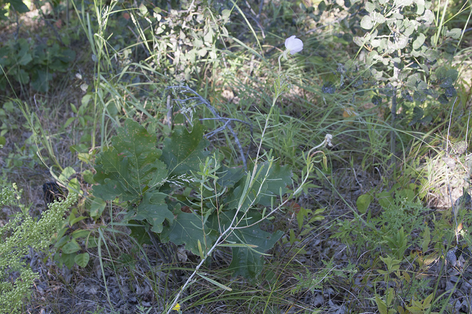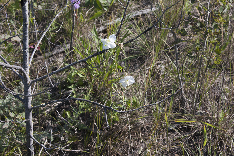 Nuttall’s evening primrose is a 12″ to 32″ tall, erect, perennial forb that rises from creeping roots. In the first year it forms a 3″ to 6″ wide rosette of basal leaves. In the second year it send up a flowering stem. It usually dies after bearing fruit once. The stem is silvery-white, erect, and branched. Near the base it is hairless and may be covered with white, peeling bark. Near the inflorescence it is covered with minute, glandular hairs. The leaves are alternate, stalkless, ascending to widely spreading, linear to linear-oblong, ¾″ to 3⅛″ long, and about ¼″ wide. They taper to the stem at the base and taper to a point at the tip with straight sides along the tip. The upper surface is hairless. The lower surface is covered with short, white, curved hairs. The margins are mostly untoothed, though sometimes there are barely perceptible teeth near the tip. The inflorescence is flowers appearing singly in the upper leaf axils. The flowers are large, showy, and stalkless. What appears to be a stalk is, in fact, an elongated ovary surmounted by a hypanthium, a floral tube formed by the fused bases of the sepals, petals, and stamens. The floral tube is yellowish-green to reddish and covered with minute, fine, short, soft hairs. When in bud it is ½″ to 1″ long or longer and drooping, with the bud nodding downward. When in bloom the floral tube elongates to 1″ to 1½″ in length, straightens somewhat, and the flower is held pointing outward or somewhat upward. The flowers are ½″ to 2″ in diameter when fully open. There are 4 sepals and 4 petals. The sepals are green, linear, and strongly bent backward along the flower stalk. The petals are white, turning pink with age; broadly elliptic or egg-shaped, and ½″ to 1″ long. There are 8 stamens of equal length, 4 united styles, and a distinctive, 4-lobed, cross-shaped stigma. The flowers have a disagreeable odor. They open around sunset and close by noon. They change from closed to fully open in just one minute. They are pollinated by hawk moths or sphinx moths, which feed on their nectar at night. The hypanthium, petals, and sepals are deciduous, withering and falling off when the fruit is formed. The fruit is a cylinder-shaped, ⅜″ to 1 3 ⁄16″ long, 4-celled capsule. The capsule is round or nearly round in cross section, and has 4 shallow, longitudinal grooves. It is densely covered with minute, white, appressed hairs. Each cell of the capsule contains one row of dark brown, egg-shaped seeds. |