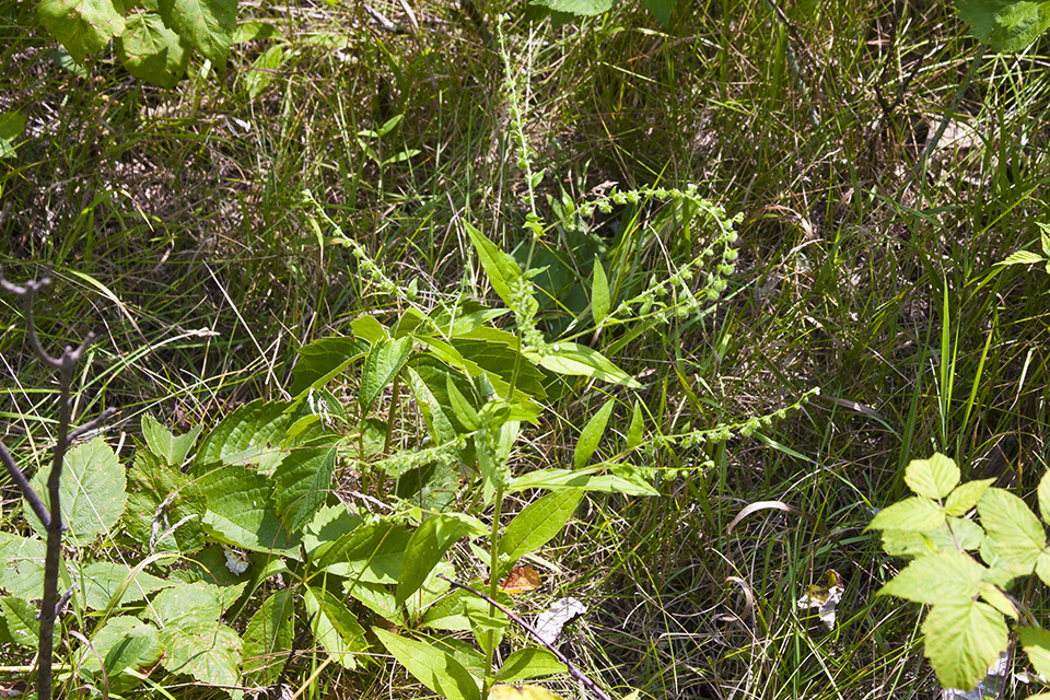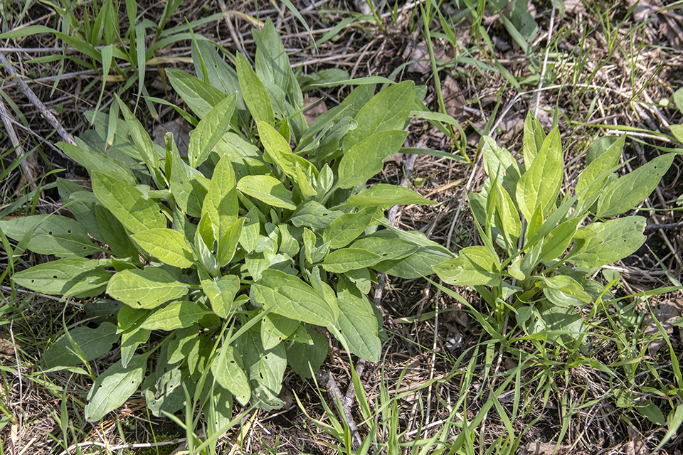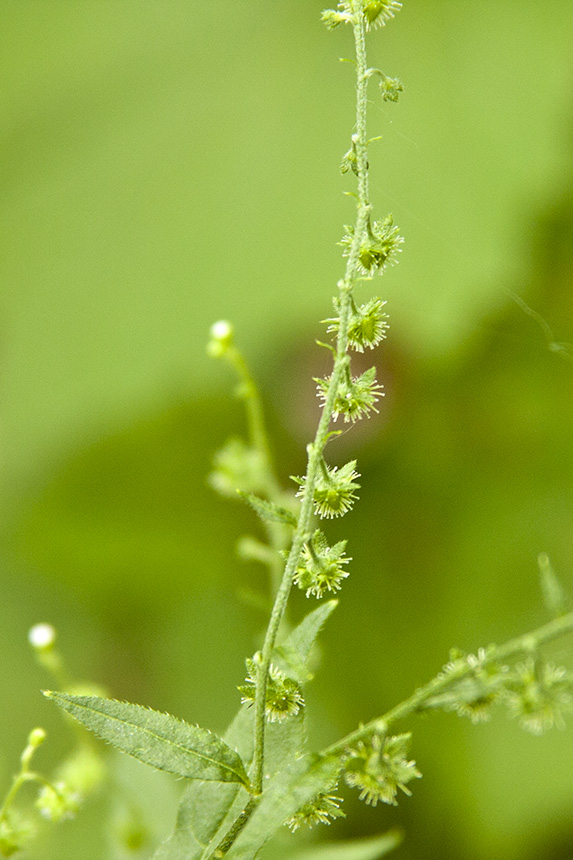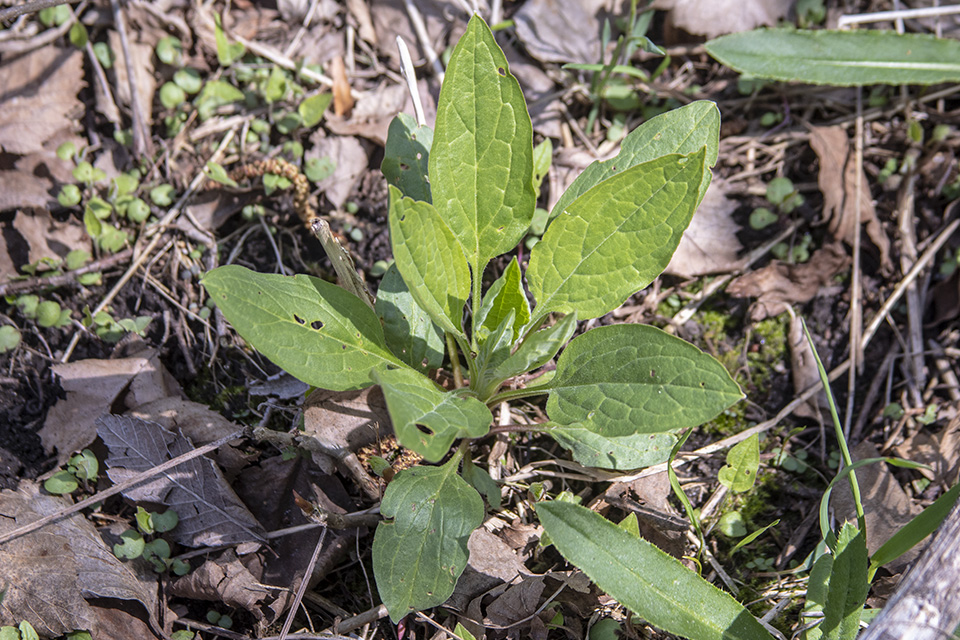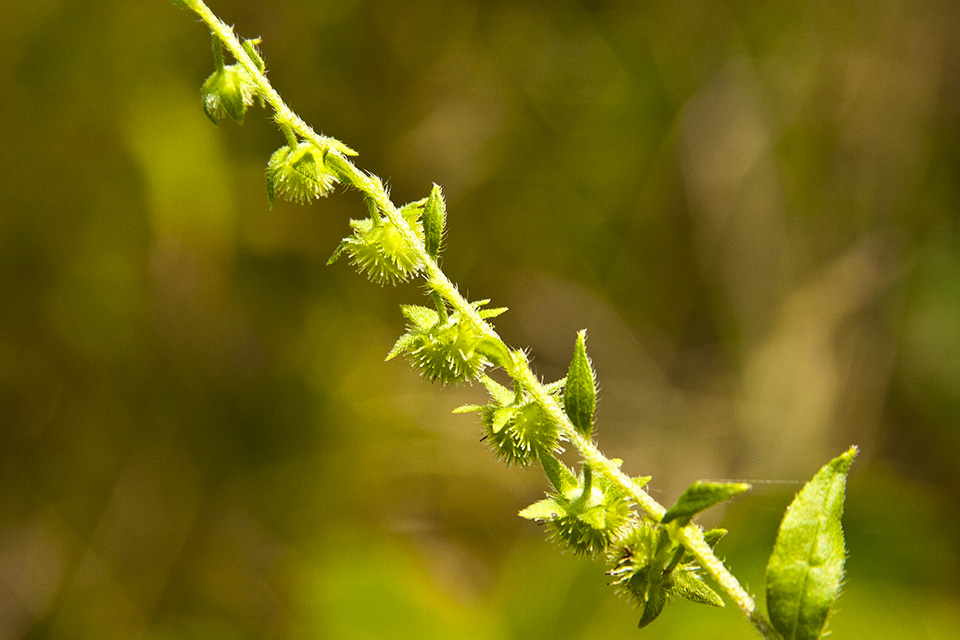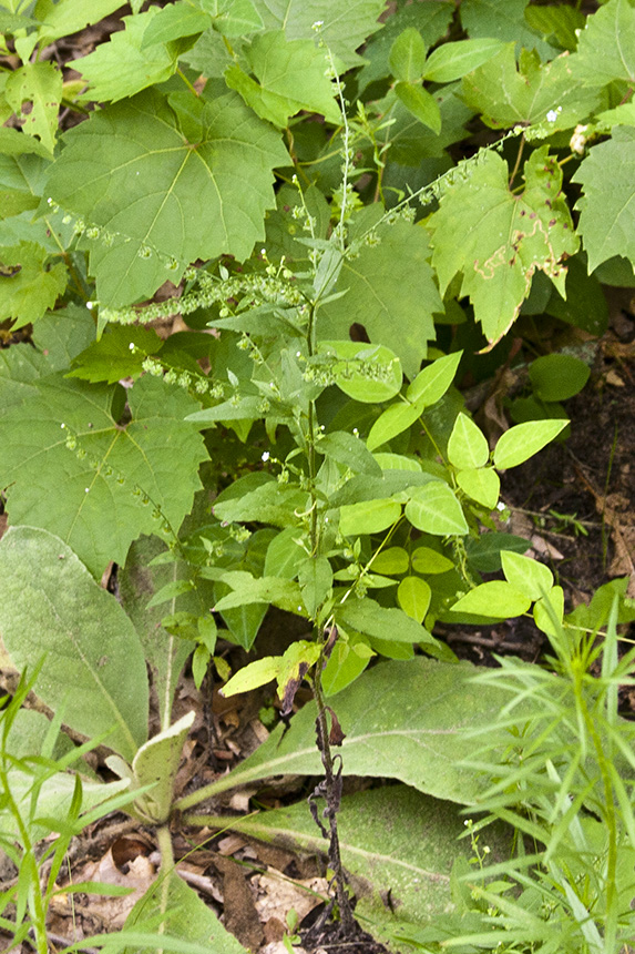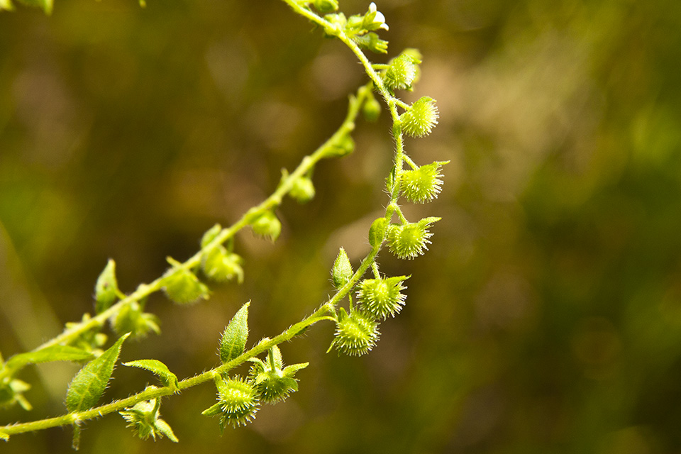 Virginia stickseed is a 15″ to 47″ tall, erect, lanky, biennial forb that rises usually on a solitary stem from a short taproot. In its first year it appears as a rosette of basal leaves. In the second year is sends up a flowering stem. The stems are erect, stout, and rough to the touch. They are moderately covered with short, fine hairs. The hairs above the midpoint are spreading or point upward, those below the midpoint point downward. They have a few to many branches above the middle. The branches are perpendicular to the stem. The lowest stem leaves are alternate, elliptic to egg-shaped, 2″ to 12″ long, and ¾″ to 4″ wide. They are on narrowly winged, up to 2″ long leaf stalks. They are abruptly narrowed at the base and taper to a sharp point at the tip with straight sides along the tip. There is a single prominent midvein and 3 to 7 noticeable pairs of lateral veins. The upper surface is rough to the touch and moderately covered with minute, stiff hairs. The lower surface is moderately covered with minute, fine hairs and, especially along the veins, longer hairs. The margins are untoothed. Lower stem leaves just above the lowest ones are similar but half as long. Stem leaves become progressively smaller, narrower, and shorter stalked as they ascend the stem. Upper stem leaves are narrowly lance-shaped and stalkless. Basal leaves are similar to lower stem leaves but are smaller. They are usually withered or absent by flowering time. The inflorescence is an unbranched array (raceme) of many small flowers. The racemes usually occur in pairs at the ends of the branches, sometimes on short branches from leaf axils. They are short and closely spaced when they first appear, 2″ to 6″ long, widely spaced, and usually coiled like a scorpion’s tail when mature. The axis of the raceme is covered with spreading to ascending hairs. The flowers are on 1 ⁄32″ to ⅛″ long stalks (peduncles). The flowers near the base of the raceme are subtended by lance-shaped to linear lance-shaped, leaf-like appendages (bracts). The bracts become progressively smaller as they ascend the stem, and disappear midway through the raceme. Each flower is 1 ⁄16″to ⅛″ in diameter. There are 5 sepals, 5 petals, 5 stamens, and 1 style. The sepals are green and covered with bristly hairs. They are fused at the base into a very short calyx tube, then separated into 5 lance-shaped, 1 ⁄32″to 1 ⁄16″ long lobes. The lobes are much longer than the tube. The petals are white (rarely pale blue). They are fused at the base into a 1 ⁄32″to 1 ⁄16″ long corolla tube, then separated into 5 rounded, 1 ⁄32″long lobes. In the throat of the trumpet shaped corolla there are 5 white scale-like appendages. The stamens have very short filaments and do not extend beyond the corolla tube. The style does not extend beyond the corolla tube. The fruit is a tight cluster of 4 nutlets. Together, the cluster of nutlets is globe-shaped, 1 ⁄16″ to ⅛″ long. The individual nutlet is densely covered with long, barbed bristles, both on the margins and on the upper (dorsal) surface, where there are 10 to 25 bristles. It is green at first, turning brown when ripe. At fruiting time the peduncles become slightly longer and droop downward; and the calyx persists, the lobes elongating to 1 ⁄16″ to ⅛″ long. The seeds spread by clinging to the fur of passing animals and the legs and socks of passing hikers. |