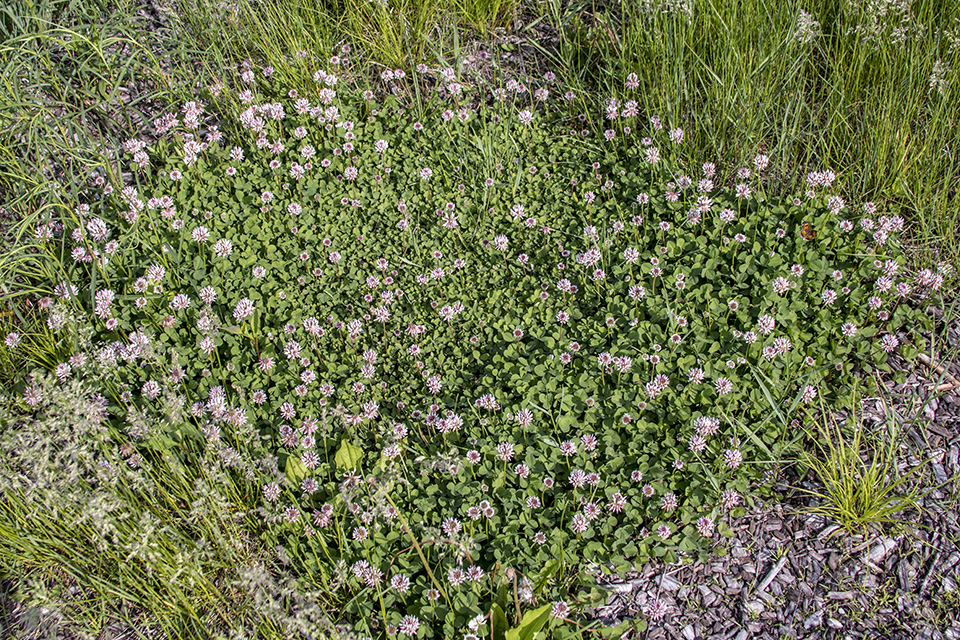 Introduced perennial herb, stems ascending, usually much less than 0.5 m tall, leaflets serrate at least distally, terminal leaflet sessile like the lateral leaflets (which is true of all Trifolium species), flowering peduncles about 15-25 mm long, pod 1-few-seeded, inconspicuous and concealed by the calyx, fruiting head retains the faded dry petals (which is true of all Trifolium species), common in mountain big sagebrush steppe where well grazed and roadsides in open montane understory. Similar to Trifolium repens, which usually has whitish petals and flowering heads that arise from axils of prostrate stems. |
