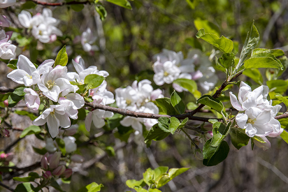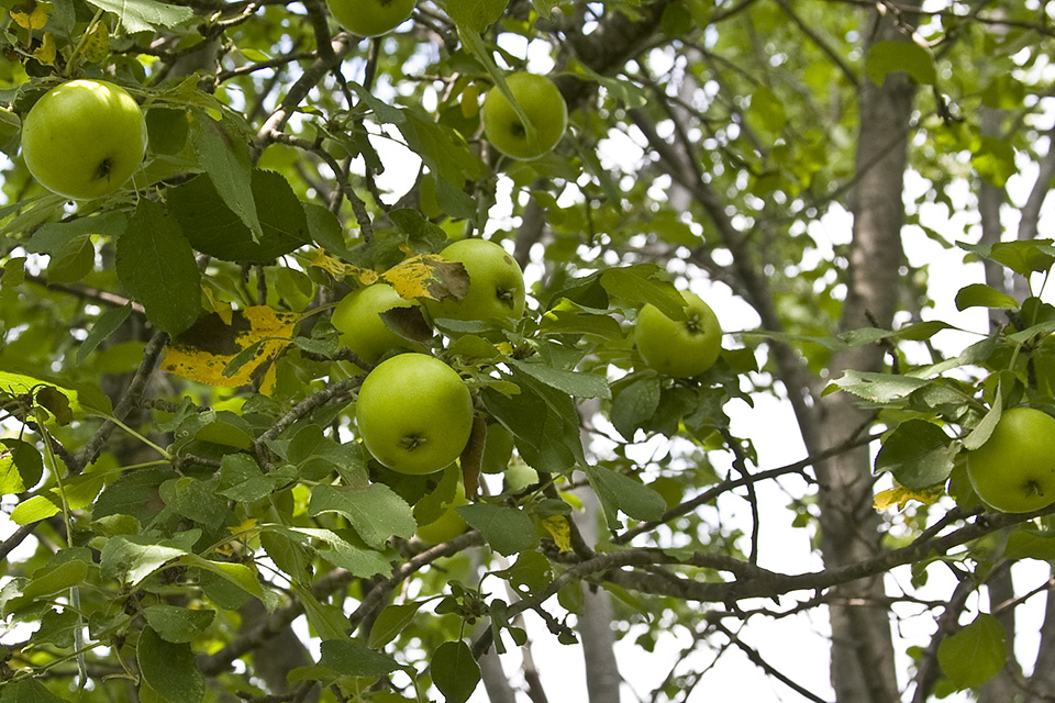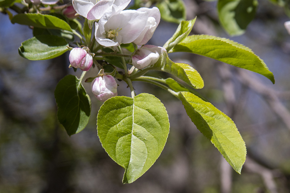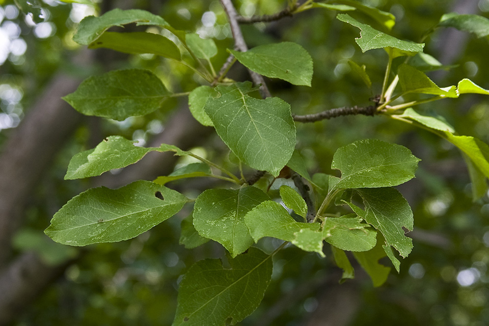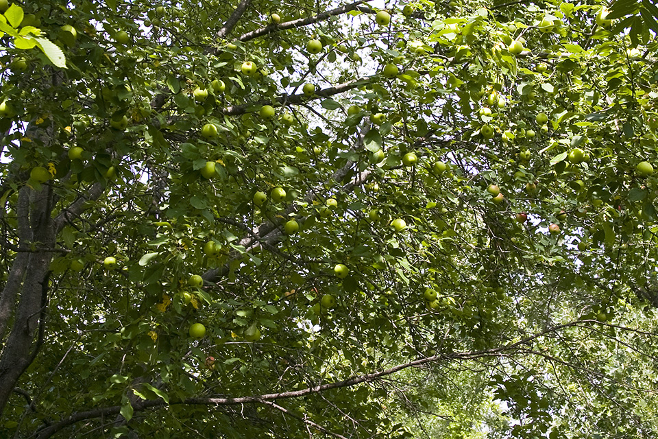 apple, also called common apple or just apple, is a small deciduous tree that reaches up to 50′ in height at maturity. The trunk is twisted. When grown in the open, the trunk divides near the ground into several major branches, and the crown is often as wide or wider than tall. When grown among other trees the trunk is taller and the crown is less spreading. Older branches on mature trees develop numerous prominent spur branches. The bark on young trees is smooth. On mature trees the bark is rough and thin, with a reddish inner bark and a gray, scaly outer bark. The twigs are moderately stout, brown to gray, and hairy when young. There are no thorns. The pith is solid and star-shaped in cross section. The leaf scars are narrow, slightly curved, and level with the twig or only moderately raised. They have 3 bundle scars. The buds are egg-shaped and are densely covered with whitish, woolly hairs. The leaves are deciduous, alternate, elliptical to egg-shaped, and 1½″ to 4″ long. They are entire, not lobed. They are rounded at the base and bluntly pointed at the tip. They are on leaf stalks that are densely covered with whitish hairs. The upper surface of the leaf blade is dark green and hairless. The lower surface is densely covered with whitish hairs. The margins are finely toothed. The flowers are large, up to 1¼″ wide. They appear after the leaves unfold in the spring. They are borne in umbrella-like clusters (umbels) on short, spur branches. There are 5 green sepals, 5 white petals tinged with pink, and 15 to 50 stamens with yellow anthers. The stamens are shorter than the petals. The fruit is a fleshy, globe-shaped to somewhat egg-shaped pome, 2⅜″ to 4⅓″ in diameter. Fruit of naturalized trees is smaller than fruit of those grown in cultivation because the latter are propagated by grafting. Naturalized trees produce fruit more than 1½″ in diameter. The fruit is green at first, turning yellow to red when it ripens in the mid- to late summer. The seed-bearing core or the pome is divided into 3 to 5 chambers. Each chamber normally contains 2 seeds. |