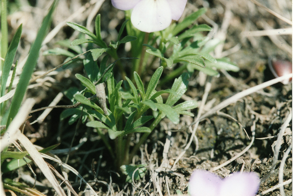 Birdfoot violet is a 3″ to 6″ tall, erect, perennial forb that rises from an erect, tuberous caudex and fibrous roots. The leaves are all basal, rising from the rootstock on hairless leaf stalks. Outer leaves are on stalks up to 1″ long, inner leaves on stalks up to 2″ long. Outer leaves are about ¾″ wide, ⅝″ long, and palmately divided into 3 deeply cut segments. The lateral segments are again divided into 3 to 5 narrowly inversely egg-shaped or inversely lance-shaped lobes. The lobes may have 2 to 4 deeply cut teeth near the tip. Inner leaves are about 1½″ wide, 1″ long, and palmately divided into 3 or 5 deeply cut segments. The segments may be again divided into 3 to 7 secondary lobes. The lobes are linear or inversely lance-shaped. Both types of leaves are hairless or nearly hairless. The margins have a fringe of minute, stiff, appressed hairs. There is no central stem. The inflorescence is a single flower at the end of a hairless, leafless, often purplish stalk. The stalk is at least as long as the leaf stalks and may be up to 4″ long. The flowers are ¾″ to 1½″ wide. The 5 petals are usually lilac purple, though the upper 2 petals are sometimes dark violet. The 2 lateral petals do not have tufts of hairs near the throat. The lower petal fades to white with purple veins near the throat, and has a hooked, rounded spur at the base. The 5 stamens are orange, conspicuously protruding, and converging, but not fused, around the ovary. Self-polinating (cleistogamous) flowers are not produced. The fruit is a ¼″ to ⅓″ long, hairless, yellowish-brown capsule. |