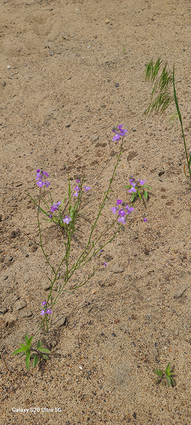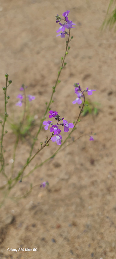 Blue toadflax is an early season prairie wildflower. It is native to North America, Mexico, and western and southern South America. It is sometimes cultivated as an ornamental. It was introduced and is naturalized in Japan, North and South Korea, eastern Russian Federation, and the Indian subcontinent. In the United States it is common in the south and on the East Coast. It is uncommon in the southeast and metro regions of Minnesota, where it is at the northwestern extent of its range, and it is absent from the remainder of the state. It is found in prairies, old fields, roadsides, and disturbed sites. It grows under full sun in dry, sandy soil. Blue toadflax is an annual forb that rises on two kinds of stems from a small taproot. First to appear is a radiating cluster (rosette) of a few to several vegetative stems. Vegetative stems are ⅜″ to 2⅜″ long (1 to 6 cm) long, hairless, and usually unbranched. They usually lay flat on the ground (prostrate), sometimes with just their tips ascending (decumbent). Some may eventually reach 4″ (10 cm) in length with age. Later, one to four flowering stems emerge. Flowering stems can be 4¼″ to 27½″ (11 to 70 cm) tall but are usually no more than 20″ (50 cm) in height. They are usually erect, but sometimes curve upward very near the base (strongly ascending), and are usually unbranched, but sometimes have a few branches near the tip. They are hairless below the inflorescence. Both kinds of stems are slender, round, and green to reddish-green. Vegetative stems are often withered or absent at flowering time. Leaves on vegetative stems are opposite or in whorls of three, 1⁄16″ to ½″ (2 to 12 mm) long, and 1⁄64″ to ⅛″ (0.5 to 3.0 mm) wide. They may be stalkless or on short leaf stalks. The leaf blades are narrow and inversely egg-shaped or elliptic. Leaves on flowering stems are alternate, unstalked, 3⁄16″ to 1⅝″ (5 to 43 mm) long, and 1⁄64″ to 1⁄16″ (0.5 to 2.2 mm) wide. The leaf blades are linear or thread-like. Leaves of both kinds of stems are unlobed, hairless, and untoothed. The inflorescence is a slender, up to 7″ (18 cm) long, unbranched arrangement (raceme) of flowers at the end of the flowering stem. The flowers are widely spaced on the raceme, even at the start of flowering time. Each flower is on a 1⁄32″ to ¼″ (1 to 7 mm) long, erect or strongly ascending stalk (pedicel). At the base of the pedicel there is a single 1⁄32″ to ¼″ (1 to 7 mm) long, linear, bluntly pointed, modified leaf (bract). The flowers have both male and female reproductive parts (perfect). They bloom from mid-May to mid-June. Each flower is 5⁄16″ to ½″ (8 to 13 mm) long including the spur. There are 5 outer floral leaves (sepals), 5 petals, 4 stamens, and 1 style. The sepals, together referred to as the calyx, are united at the base then separated into 5 narrow, sharply pointed, 1⁄16″to ⅛″ (2.1 to 3.5 mm) long lobes. They are green to purplish-green and sometimes hairless but more often glandular-hairy toward the base. The petals, together the corolla, are light blue to light purplish-blue. They are united at the base then separated into two unequal lips. The upper lip is 1⁄32″ to 1⁄16″ (1.2 to 2.0 mm) long, sometimes a little longer, and divided into two equal lobes. The lobes are erect or slightly angled backward. The lower lip is 1⁄16″ to ¼″ (2 to 5 mm) long and is divided into three rounded, spreading lobes. The base of the lower lip is white and strongly arched. A nectar spur extends backward from the throat of the corolla. The spur is 1⁄16″ to ¼″ (2 to 7 mm) long and may be straight or curved. The stamens are arranged as two pairs of unequal lengths. The stalks (filaments) are hairless. The style has an unlobed, cap-like stigma. The fruit is a ⅛″ (2.6 to 3.9 mm) long, ⅛″ (2.6 to 3.3 mm) wide, oblong egg-shaped capsule with 100 to 200 seeds. |