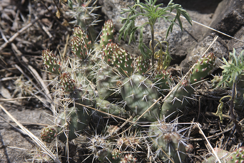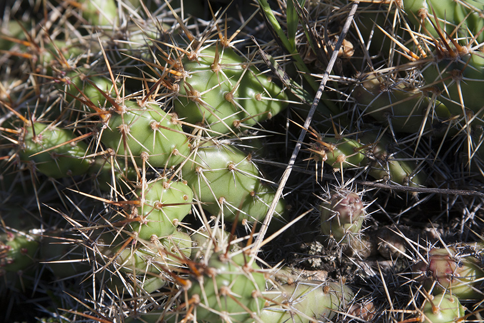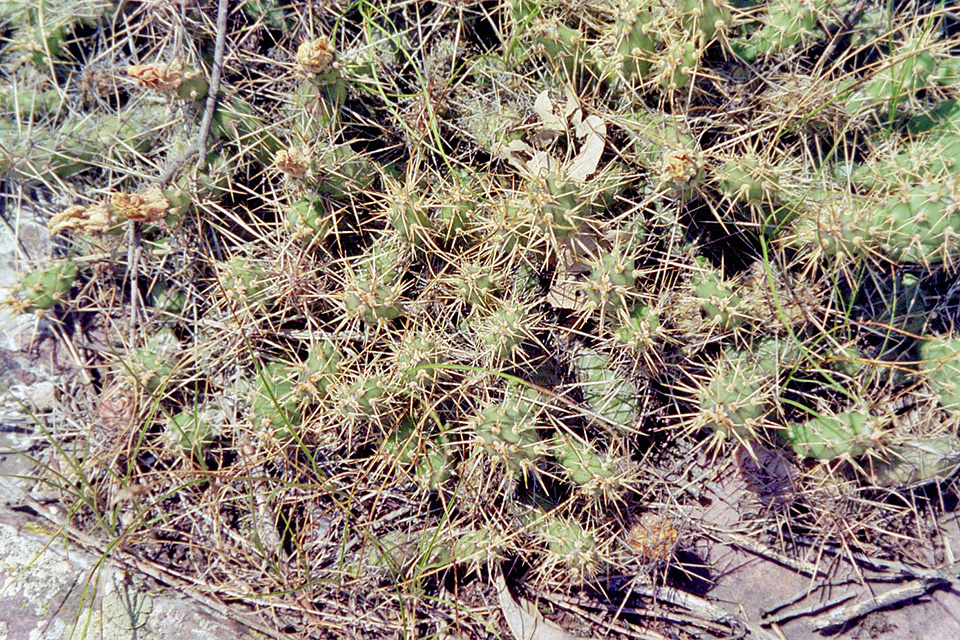 Brittle prickly pear is a prostrate or spreading, perennial, succulent shrub. It forms dense mats 2″ to 4″ tall and up to 20″ wide. It flowers infrequently, if at all. The stems are prostrate or spreading, branched, and jointed. The stem segments (joints) are dark green, very swollen, hairless, ¾″ to 2″ long, ⅜″ to 1″ wide, and variable in shape. They may be almost circular to almost cone-shaped, or egg-shaped and slightly flattened. The terminal joint on each stem is easily detached. The areoles are densely woolly and crowded. They are armed with 1 to 4 central, ½″ to 1″ long, gray spines with brown tips, and 4 to 6 outer, smaller spines. Most areoles have a total of 3 to 8 spines. The glochids are tan to brown, inconspicuous, up to ⅛″ long, in a crescent at the upper margin of the areole. The inflorescence is a solitary, 1 9 ⁄16″ to 2″ wide, yellow to greenish flower. The fruit is a pear-shaped, ⅜″ to 1¼″ long, 5 ⁄16″ to ⅝″ wide berry. It is greenish to reddish and fleshy when young, tan and dry at maturity. It is inedible. |