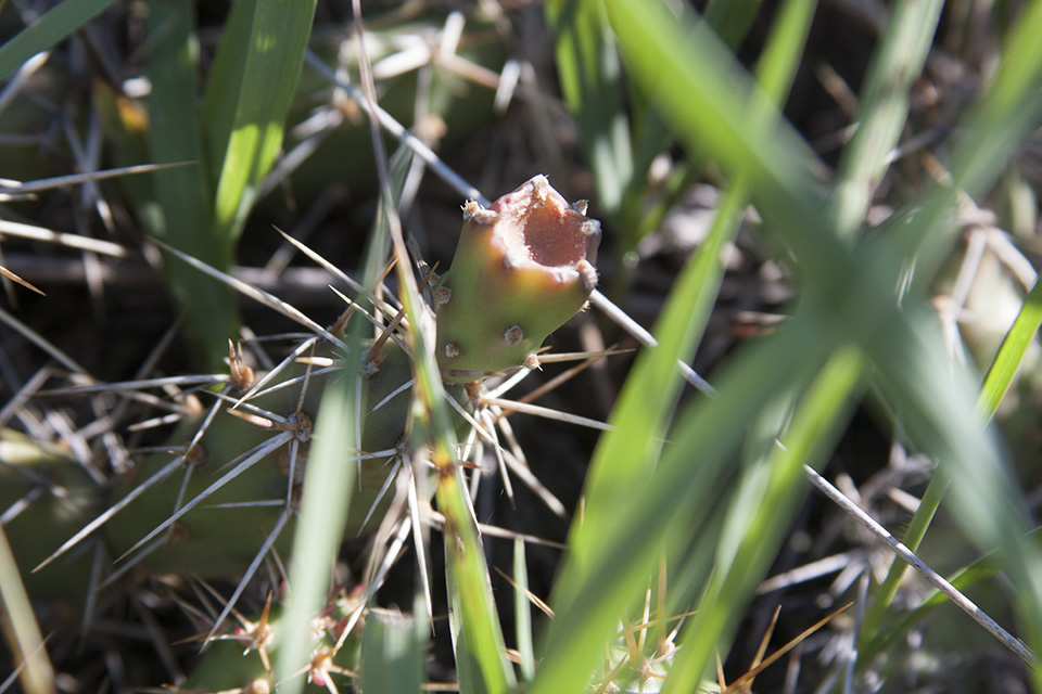 Plains prickly pear (Opuntia macrohiza) has conspicuously flattened pads. | ||