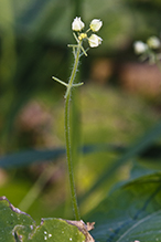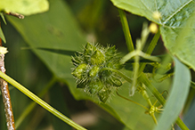 Bur cucumber is an annual, herbaceous vine produces multiple lanky, prostrate or climbing stems from a shallow, branched taproot. It has separate male and female flowers, both appearing on the same plant. The stems are light green and hairy. They can extend 18′ to 25′. The tendrils are branched. The leaves are alternate and are attached to the vine on 1″ to 3″ long leaf stalks. They are up to 8″ long and 8″ wide. They have 3 to 5 shallow lobes with pointed tips, and are deeply-cleft at the base where they attach to the leaf stalk. The margins have tiny, widely-spaced teeth. The leaf surfaces are rough to the touch. The upper surface si mostly hairless, the lower surface is covered with fine, short hairs. The male and female flowers are borne separately from the same leaf axils. The male inflorescence is a 12″ to 16″ long, erect cluster of many flowers. The female inflorescence is a small, head-like cluster on a shorter stalk. The flowers are ⅓″ to ½″ wide and star-shaped. They have 5 petals that are pale green with darker green veins. There is no fragrance. The fruits are in clusters of 3 to 5. Each fruit is a ⅓″ to ½″ long, egg-shaped capsule covered with spiny prickles and long white hairs. It contains 1 seed. |