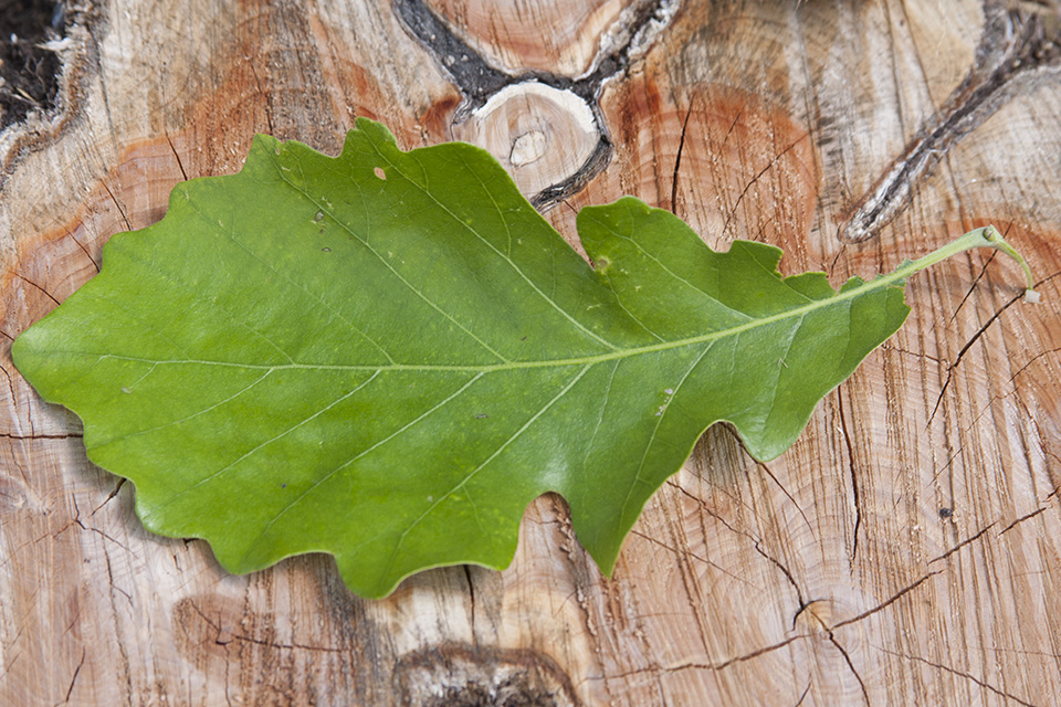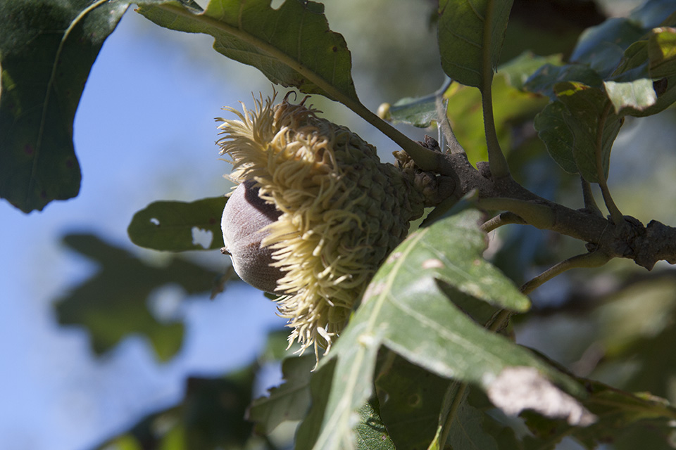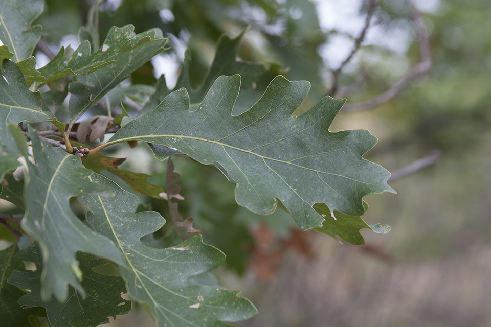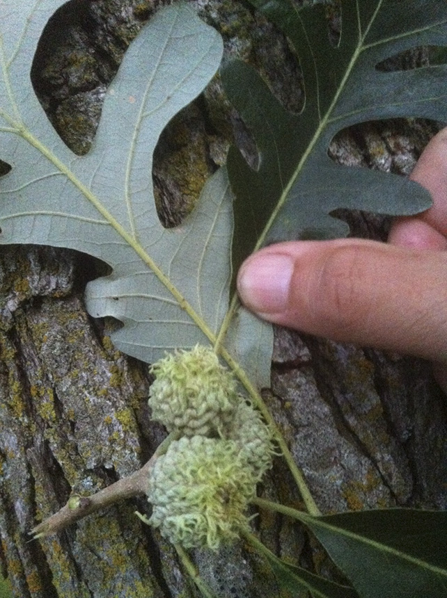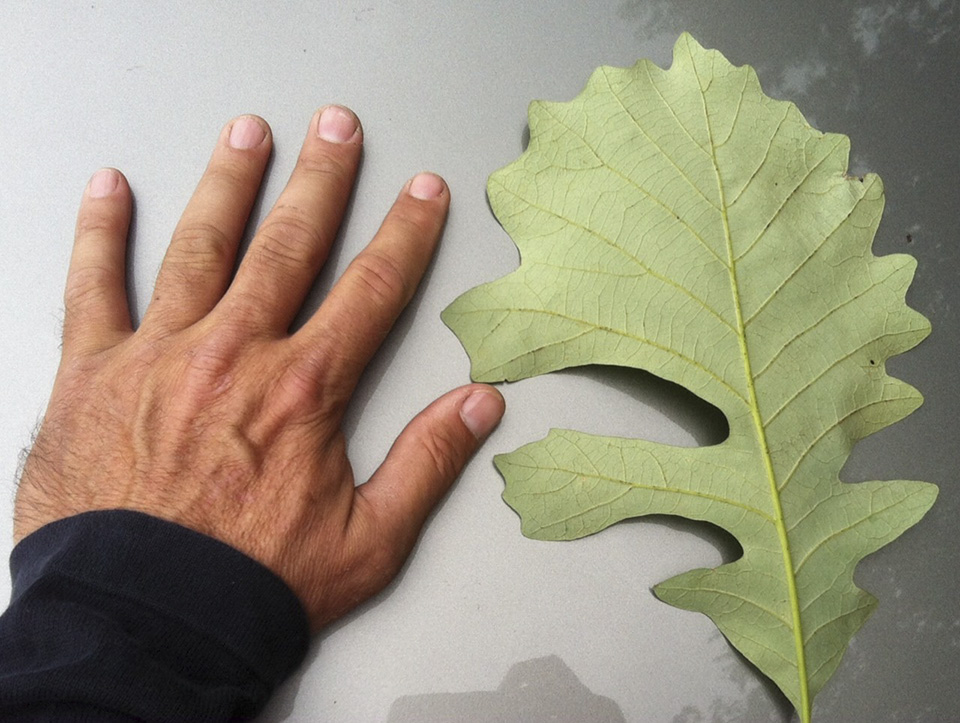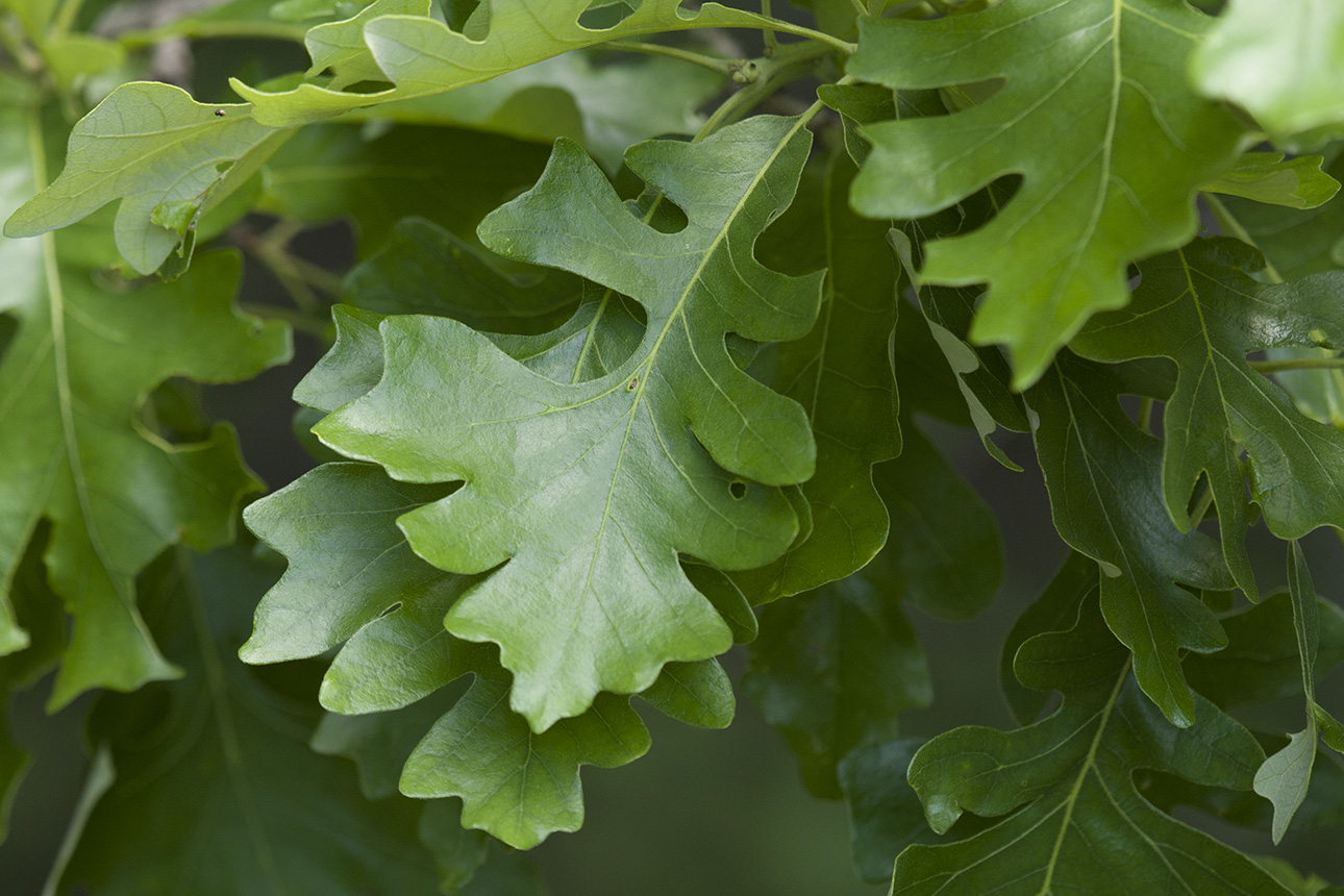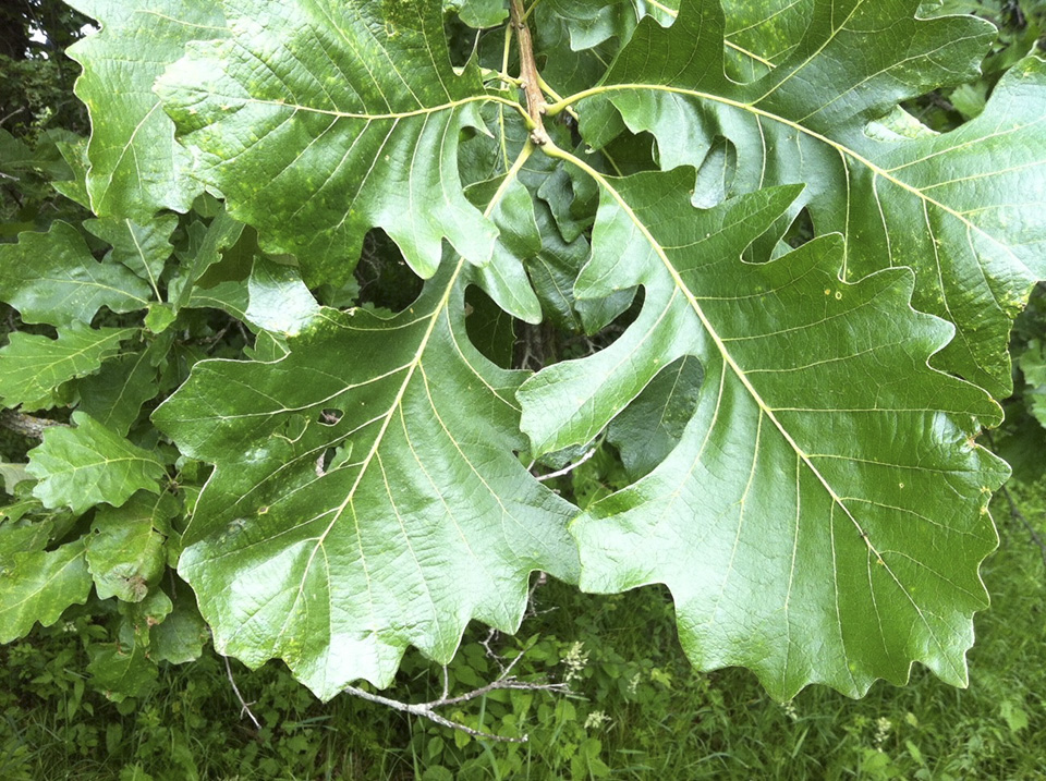 Bur oak is a slow growing, long-lived, deciduous tree rising on a single trunk from a taproot and widely spreading roots. The root system is massive—the weight of the root system equals the weight of the above-ground growth of the tree. In Minnesota mature trees are usually 50′ to 80′ tall and up to 43″ in diameter, though individuals can reach over 100′ in height. In open areas with deep soil the trunk is straight and is distinct to the upper crown. In less favorable conditions the trunk splits into heavy, gnarled, ascending branches. The branches are ascending to spreading; ascending in the upper part of the crown, nearly horizontal in the lower part. The crown of young trees is tall and oval with a rounded top. In open areas the crown of mature trees can be very broad. The bark on young trees is rough. On mature trees the bark is thick and ashy gray, with deep furrows and ridges that are broken into irregular, dark gray scales. The twigs are stout, yellowish- to grayish-brown, and slightly hairy. Branchlets often develop flat, radiating, corky wings. Terminal buds are reddish-brown, hairless, round, 1 ⁄16″ to ¼″ long, and blunt at the tip. Lateral buds are 1 ⁄16″ to 3 ⁄16″ long and are closely appressed to the twig. The leaves are alternate, leathery, 4⅓″ to 8″ long, 2¾″ to 6″ wide, and inversely egg-shaped in outline but otherwise variable in shape. They are on hairy leaf stalks that may be ⅜″ to 1 3 ⁄16″ long, but are usually ⅝″ to 1″long. The leaf blade is rounded or wedge-shaped at the base. There are 2 to 6 large, irregular, rounded, primary lobes and 2 to 10 smaller, rounded, secondary lobes or rounded teeth per side. The deepest sinuses, near the center of the blade, are usually very deep, extending 50% to 90% of the way to the midvein. Most leaf blades are fiddle-shaped, with a broad, expanded, shallowly lobed upper half (terminal lobe) above a deep sinus and a few short lobes on the lower half. The upper surface is dark green, shiny, and hairless or sparsely hairy. The lower surface is pale green or gray and densely hairy with short, appressed, star-shaped hairs, making it velvety to the touch. Male and female flowers are borne on the same tree. Male flowers are in slender, ¾″ to 2⅜″ long catkins that hang downward from buds on branchlets of the previous year. Female flowers appear in clusters of 1 to 3 on a short stalk rising from leaf axils of the current year’s twigs. The flowers appear after the leaves in May to early June. The fruit is a large, narrowly egg-shaped to flattened egg-shaped, 9 ⁄16″ to ⅞″ long, ⅜″ to ⅝″ wide acorn. This is the largest acorn of any of the native oaks. They are in clusters of 1 to 3 acorns on a short, stout stalk. A scaly, dome-shaped cup encloses ½ to ⅞ or more of the lower part of the nut. There is a conspicuous fringe of soft, curly, 3 ⁄16″ to ⅜″ long awns along the rim of the cup, which gives this tree its common name. The inside of the acorn cup is uniformly hairy. The nuts ripen in early August to early mid-September of the first year. It tastes sweet or slightly bitter. |