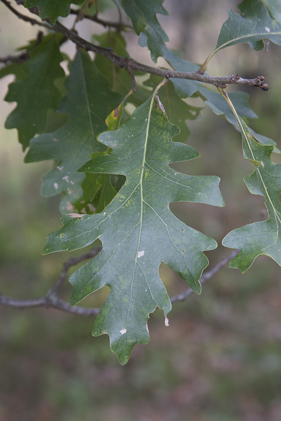 Bur oak (Quercus macrocarpa var. depressa) is found along the western margin of the Great Plains. It is a shrub or small tree no taller than 16′ that occurs on bluffs and hillsides. The acorns are smaller with smaller, less fringed cups. White oak (Quercus alba) bark is thin and fine-textured. The branchlets do not have corky ridges. The lateral buds diverge from the twig. The leaves are more uniformly lobed and never has a large terminal lobe. The underside of the mature leaf is hairless or has a few hairs along the main veins. The acorn cup encloses only the lower ¼ to ½ of the nut, and does not have a fringe of awns along the rim. |