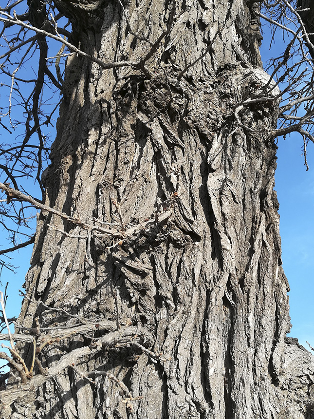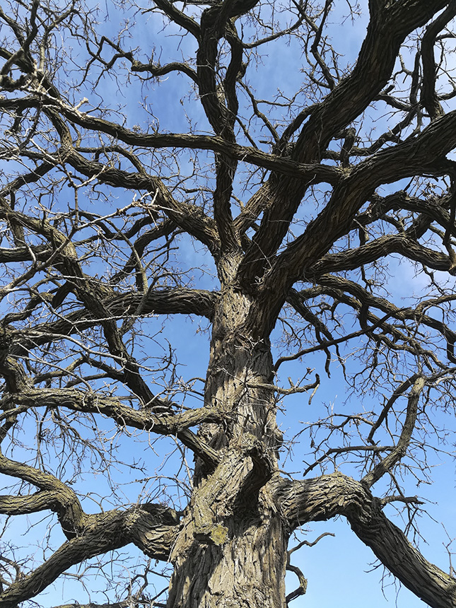 The strong branching, gnarly habit of bur oak, as exhibited by a fine old open-grown specimen in Albert Lea, Freeborn County, MN |