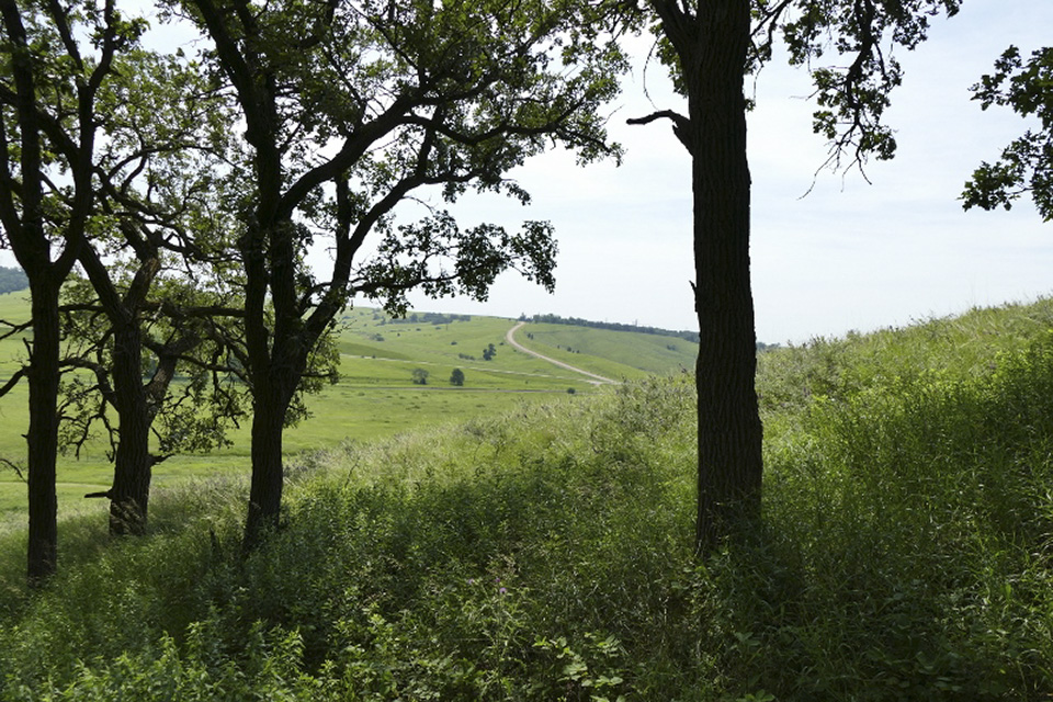 This is a photo of that bur oak grove with the one big one and some smaller ones on top one of the big hills at Frenchman’s Bluff SNA. I took it Feb. 1, 2025. |