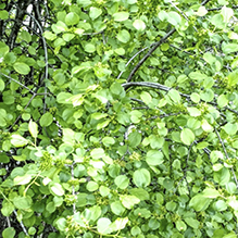 Common buckthorn is usually a tall shrub, sometimes a small tree. It rises from a woody taproot on 1 or a few stems. It is moderately fast-growing, short-lived, 16′ to 25′ tall, and up to 5″ in diameter at breast height. The bark on young stems is smooth, thin, shiny, gray to reddish-brown, with numerous prominent, elongated lenticels. On older stems the bark is dark gray and scaly or peeling with curly edges, revealing orange inner bark. First-year twigs are slender, stiff, green to brownish-green, and hairless. Second-year twigs are brown with a gray, flaky outer layer. There is a thorn at the tip of many of the the twigs, giving this plant its common name. There are additional dwarf spur branches with a thorn at the tip. The thorns are between the last pair of lateral buds. Buds are about ¼″ long, egg-shaped, sharply pointed, reddish-brown to dark brown, opposite or almost opposite, and appressed to the twig. They are covered with a few distinctly overlapping scales. The scales have a margin of fuzzy hairs. The leaf scars are small, crescent-shaped, distinctly raised, and have 3 bundle scars. The leaves are deciduous and usually opposite or almost opposite, sometimes alternate. They are on hairy, ⅜″ to 1⅜″ long leaf stalks that are grooved on the upper side. The leaf blades are inversely egg-shaped to elliptical, 1½″ to 2⅜″ long, and ¾″ to 1½″ wide. They are rounded or tapered at the base and usually abruptly pointed, sometimes rounded, at the tip. There are 3 to 5 lateral veins on each side of the midrib. The veins are strongly curved, arching toward the tip. They are depressed on the upper side of the leaf and stand out on the underside. The upper surface of the leaf blade is medium green to dark green and hairless or nearly hairless. The lower surface is somewhat pale green and hairy or nearly hairless. The margins are finely toothed. The leaves stay green into late fall. The inflorescence is a stalkless, umbrella-like cluster (umbel) of 1 to 5 flowers rising from the leaf axils of the lower part of current year’s long twigs and from short spur branches. Male and female flowers appear on separate plants. The flowers are about ¼″ wide. They have 4 conspicuous, spreading, yellowish-green sepals and 4 shorter, inconspicuous, erect, green petals. Male flowers have 4 stamens, female flowers have 1 style. Each flower is on a ⅛″ to 5 ⁄16″ long, usually hairless flower stalk. They appear in mid-May to mid-June after the leaves have formed. The fruit is a berry-like, 3 ⁄16″ to 5 ⁄16″ in diameter drupe containing 3 or 4 seeds. It is green at first, eventually turning bluish-black at maturity. It matures in late August to late September and often remains on the twig long into winter. |