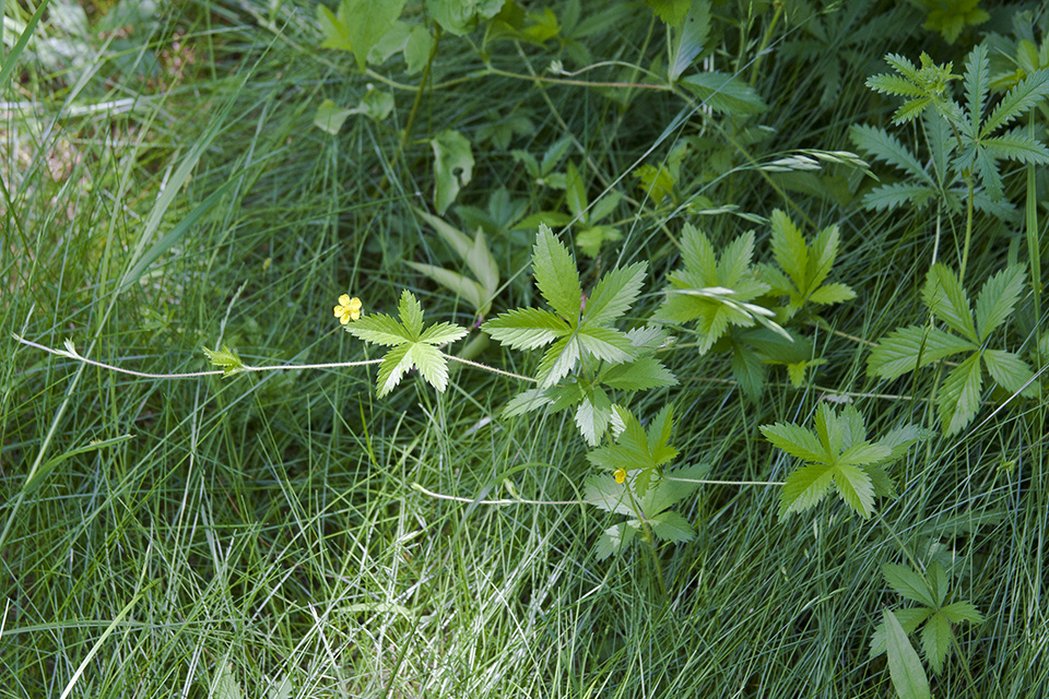 Common cinquefoil is a 2″ to 12″ tall, erect, ascending, or sprawling, perennial forb that rises from a rhizome. It often forms loose colonies. The plant is erect at first, reaching up to 12″ at first flowering. Later, the stems lean becoming widely ascending. Still later, they arch to the ground and sprawl along the ground with the tip ascending. These runners extend 6″ to 20″, have long spaces between the nodes, and root at the nodes. Eventually, they root at the tip, and produce a terminal tuber. The stems are thin, and covered with long, soft, shaggy but unmatted hairs. They are initially green becoming reddish with age. The leaves are alternate and palmately divided into 5 leaflets. The leaflets are inversely egg-shaped to elliptic, ¾″ to 2¾″ long, and up to ¾″ wide. Young leaflets are narrow with margins curled up. The margins are coarsely toothed except near the base, where the leaflet attaches to the stem. The upper surface is hairless and conspicuously veined. The lower surface is hairy or nearly hairless. The inflorescence is a single flower rising on a long, thin, hairy stalk from some of the upper leaf axils. The lowest flower usually arises from axil of the second well-developed leaf. The flowers are 2 ⁄5″ to 3 ⁄5″ wide.The 5 petals are yellow, broad, narrow at the base, rounded at the tip, and sometimes slightly notched at the tip.The 5 green sepals are a little shorter than the petals and alternate with the petals. The 5 bractlets are smaller than the sepals, alternate with the sepals, and are hidden below the petals when the flower is viewed from above. There are 20 yellow stamens. There is no floral scent. |