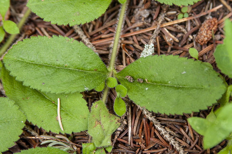 Common speedwell is a common exotic weed. It is native to Europe and Asia. It was introduced into North America as an ornamental, escaped cultivation, and is now naturalized in two widely separated ranges. The eastern population extends from Maine to Minnesota south to North Carolina and Missouri, and in Canada from New Brunswick to Ontario. The western population extends from Washington and Oregon to Montana and Wyoming, and in Canada from British Columbia to Alberta. Common speedwell is an erect, perennial forb that rises on a single stem from fibrous roots. The stem is up to 16″ long, lies flat on the ground,and is slightly curved upward (ascending) at the tip. At intervals it produces a small swelling (node). Fibrous roots develop on the lower side of the node and single branch rises from the upper side. It often forms dense mats. The stem is green and is densely and uniformly covered with spreading, non-glandular hairs. The branches are erect or ascending, 2″ to 10″ tall, green, leafy, and densely and uniformly covered with spreading, non-glandular hairs. The leaves are opposite, ⅝″ to 2″ (15 to 50 mm) long, ¼″ to 1 3 ⁄16″ (6 to 30 mm) wide, about 1½ to 3 times as long as wide. The leaf blades are elliptic (widest at the middle) or inversely egg-shaped (widest slightly above the middle), angled to a short stalk at the base, and rounded or bluntly pointed at the tip. The upper and lower surfaces are moderately to densely covered with soft, spreading, non-glandular hairs. The margins are finely toothed, the larger leaves with 12 to 20 teeth per side. The inflorescence is usually a solitary, spike-like, unbranched cluster (raceme) of several flowers rising from only the upper leaf axils. Occasionally there are two racemes rising from the same leaf axil. The small flowers are on 1 ⁄32″ to 1 ⁄16″ (1 to 2 mm) long stalks (pedicels). At the base of each pedicel there is single small modified leaf (bract). The bract is green, narrowly lance-shaped, and longer than the pedicel. It is covered with spreading, gland-tipped hairs. Each flower is ¼″ to ⅜″ in diameter. There are 4 outer floral leaves (sepals), 4 petals, 2 stamens, and 1 style. The sepals are green, ⅛″ to ¼″ (4 to 6 mm) long, and covered with spreading gland-tipped hairs. They are fused at the base into a short calyx tube, then separated into 4 lance-shaped lobes. The petals are light blue or lavender with dark veins. They are fused at the base into a short tube then separated into 4 lobes that are much longer than the tube. The upper three lobes are round to egg-shaped, ⅛″ to 5 ⁄16″ (4 to 8 mm) wide, and about equal in size. The lower petal is as long but much narrower. The stamens have white anthers and project well beyond the petals. The style is ⅛″ (3 to 4 mm) long and also projects well beyond the petals. The fruit is a flattened, yellowish-brown, ⅛″ (4 mm) long, ⅛″ (4 mm) wide, capsule with 12 to 24 tiny seeds. The capsule is broadly triangular or slightly heart-shaped with just a shallow notch at the tip. The surfaces and margin are covered with gland-tipped hairs. |