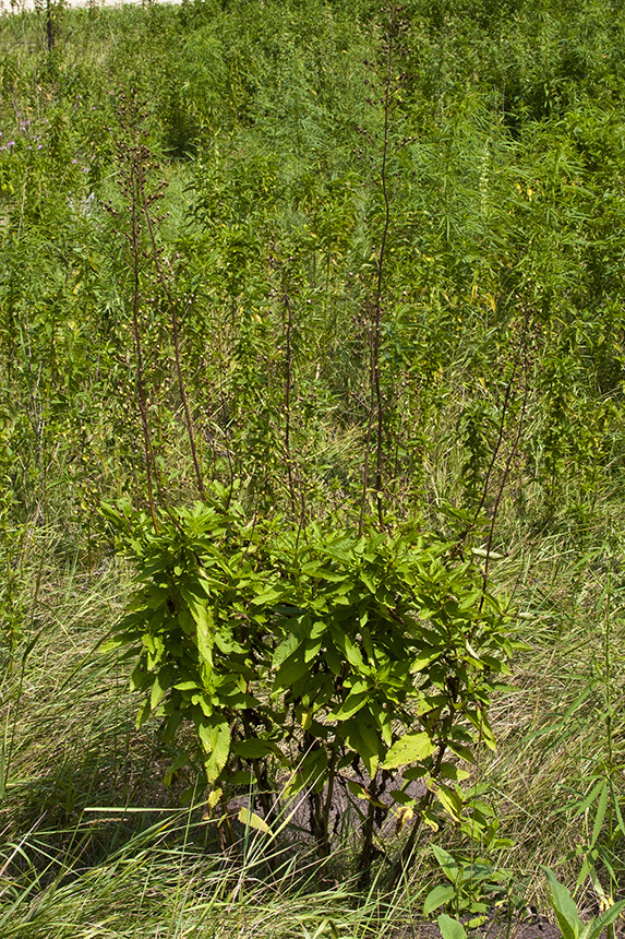 Late figwort (Scrophularia marilandica) stems of older plants are rounded and prominently grooved between the angles. The inflorescence is loose, pyramid-shaped, irregularly branched, and up to 6″ wide. The sterile staminode is purple, not yellow. |