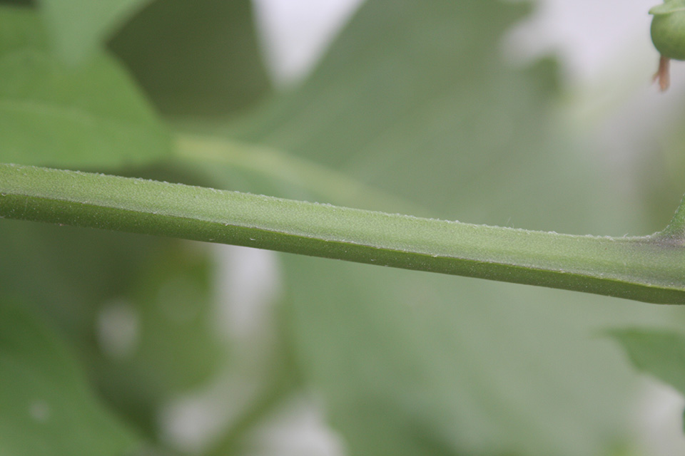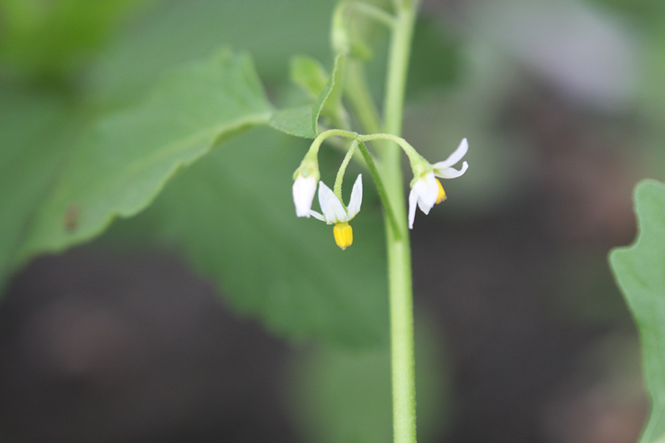 Eastern black nightshade is a 6″ to 24″ tall, erect, annual forb that rises from a slender taproot. The stems are erect and branching and are covered with short, incurved hairs, especially near the top. The leaves are alternate, egg-shaped to triangular, and ¾″ to 3″ long, ⅜″ to 2″ wide, on long, slender leaf stalks. The margins have 2 to 5 irregular, blunt teeth on the lower half, no teeth on the upper half. There are scattered, short, incurved hairs on the upper and lower surfaces, especially on the lower surface. The underside is green when young, turning purplish or purple with age. The inflorescence is an umbrella-shaped cluster of 3 to 10 flowers on an ascending stalk (peduncle) up to 1⅛″ long arising from the upper portion of the stem, not from leaf axils, and not at the end of the stem. The individual flowers are on nodding, closely-clustered stalks that originate at more or less the same point at the end of the peduncle. The peduncle and the individual flower stalks are covered with short, incurved hairs. The flowers are from less than ¼″ to ⅓″ wide. There are 5 white petals that are widely spreading, eventually curving backward, and form no tube at the base. There are 5 stamens with large yellow anthers projecting from the center of the petals. The anthers converge around the style but are not actually fused together. The fruit is a berry, green and mottled when young, black or purplish black when ripe. At the base of the fruit the sepals (calyx) has 5 bluntly triangular lobes that are spreading and do not cup the berry. |