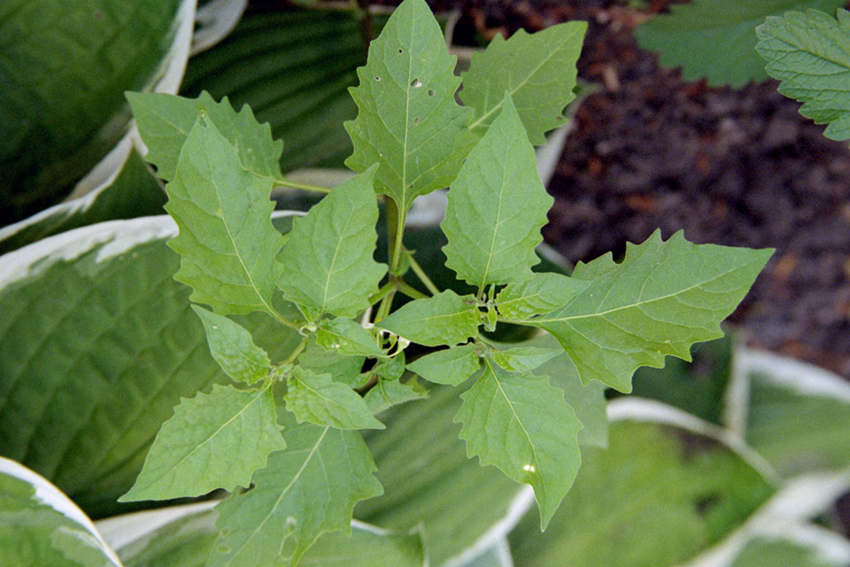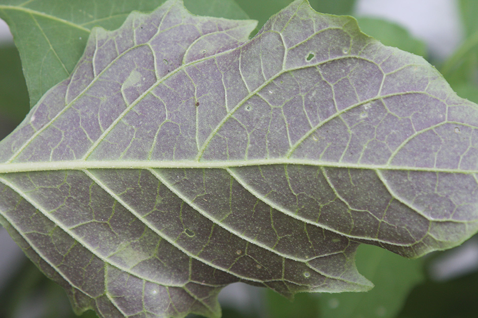 Common lamb’s-quarters (Chenopodium album) leaves are whitish on the underside, not purplish. | ||