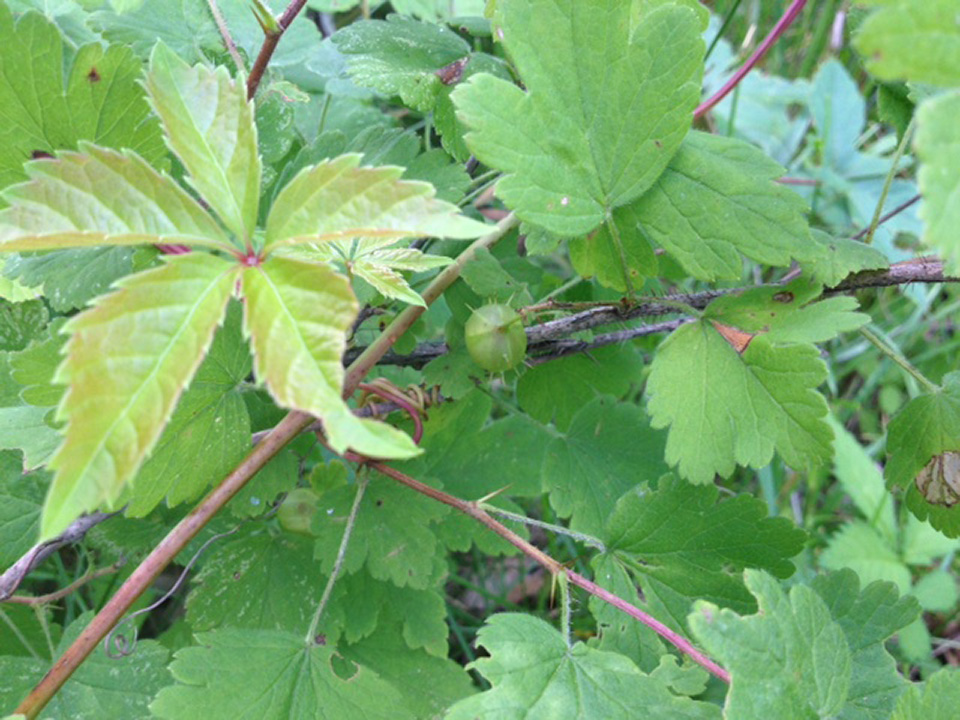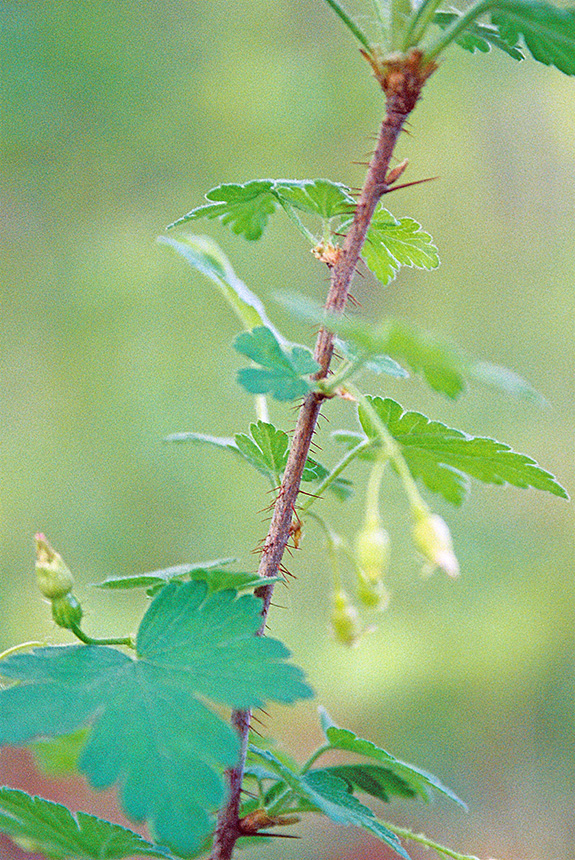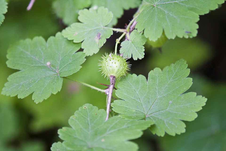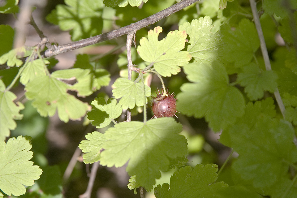 Eastern prickly gooseberry is a 24″ to 48″ tall, erect, perennial shrub that rises on multiple stems from a branching, woody root system. In Minnesota it is usually about 36″ tall. The stems are ascending, arching, or prostrate on the ground and creeping (trailing), occasionally branching, and 24″ to 80″ long. Long stems may arch to the ground and root at the tip, forming a crown that sends up new stems. Other stems may be trailing and may root at the nodes. First year stems are green and hairy. They become gray or brown and hairless by the third year. The stems and branches have 1 to 3 straight, 3 ⁄16″ to ⅝″ long spines just below the nodes. The stems also have stiff, slender, brown to reddish-brown, up to ¼″ long bristles between the nodes. The branches have fewer bristles or no bristles between the nodes, especially near the top of the plant.. The leaves are alternate and occur singly or in small clusters (fascicles) of 2 or 3. They are round to oval in outline, ¾″ to 2⅛″ long and wide, and are on hairy, ½″ to 1″ long leaf stalks. The leaf blades are palmately divided into 3 or 5 lobes. The lobes may be further divided into 3 or 5 shallow secondary lobes. The base is usually shallowly heart-shaped, sometimes rounded or truncate. The upper surface is dark green and softly hairy when young, usually without glandular hairs, becoming hairless with age. The lower surface is similar but pale green. The margins are toothed with rounded teeth. The inflorescence is a loose, unbranched cluster of 1 to 3, rarely 4, flowers rising from the leaf fascicles. It is on a slender, ¼″ to 1″ long stalk that has both glandular and non-glandular hairs. Each flower is about ⅓″ long and droops downward on a slender, 3 ⁄16″ to ⅝″ long stalk that has both glandular and non-glandular hairs. There is a pair of bracts at the base of the flower stalk. The bracts are 1 ⁄32″ to ⅛″ long, shorter than the flower stalks, and are fringed with glandular hairs. At the base of the flower is a green ovary that is covered with stiff, glandular hairs that harden into prickles on the fruit. Above the ovary is a green, bell-shaped, ⅛″ to 3 ⁄16″ long, cup-like structure (hypanthium). At the end of the hypanthium are 5 sepal lobes. The lobes are green, sometimes tinged with purple, 1 ⁄16″ to ⅛″ long, and initially erect but soon bending sharply backwards. The sepal lobes are shorter than the calyx tube (the outer portion of the hypanthium). Also at the end of the hypanthium are 5 white, inversely egg-shaped, 1 ⁄32″ to 3 ⁄32″ long petals. Emerging from the hypanthium are 5 stamens, about as long as the petals, and a style, about as long as the sepals. The style is divided for the upper third of its length. The fruit is a globular, 5 ⁄16″ to 9 ⁄16″ in diameter berry with conspicuous prickles. Immature berries are shiny green with narrow, pale green, vertical stripes. When ripe they are dull red or dull purple. They are held well away from the stem. |