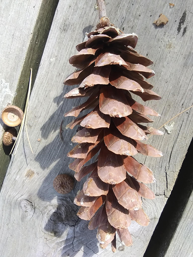 There are two co-champion eastern white pines in Minnesota. One is in Forestville State Park near the entrance in Fillmore County. In 2009 it was measured at 103′ tall and 214″ in circumference (68″ in diameter), with a crown spread of 84′. One is on private property near Glen, in Aitkin County. In 2021 it was measured at 121′ tall and 198″ in circumference (63″ in diameter), with a crown spread of 68′. |