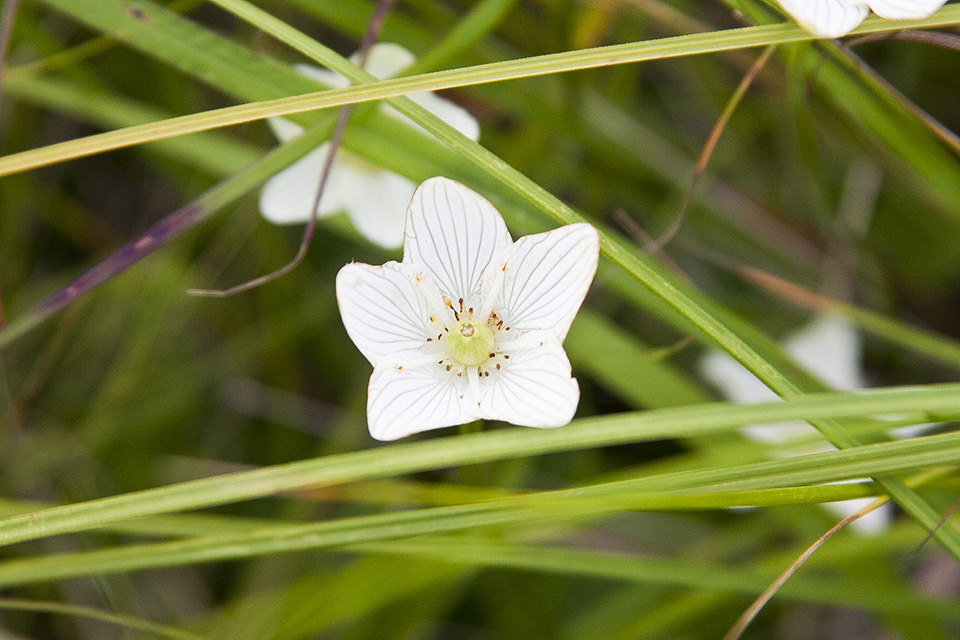 Fen grass of Parnassus is a 8″ to 16″ tall, erect, perennial forb that rises from a short, thickened, underground stem (caudex) abd fibrous roots. Basal leaves are on long leaf stalks and form a rosette. They are stiff, leathery, hairless, egg-shaped to almost circular, 1⅛″ to 2″ long, and ⅝″ to 1¾″ wide. They are always longer than wide. The base is broadly rounded or slightly heart-shaped. The blade extends down the leaf stalk a short distance below the point of attachment. The margins are untoothed. A single, unbranched, hairless, 8″ to 16″ long flowering stalk (scape) rises from the rosette of basal leaves. There is usually a single leaf-like bract at or well below the middle of the stem. The bract is similar to the basal leaves only smaller. It is stalkless or on a short stalk, but does not clasp the stem. The inflorescence is a single flower held erect at the end of the stem. The flowers are ¾″ to 1½″ wide. Each flower has 5 green sepals and 5 white, ⅜″ to 11 ⁄16″ long petals with conspicuous, dark green veins. The 5 center veins of each petal are usually unbranched. There are 5 white stamens with brown anthers. There are also 5 white sterile stamens (staminodes) that are divided into 3 filaments for 3 ⁄5 or 4 ⁄5 of their length, each filament topped with an anther reduced to a gland. The staminodes are a little shorter than the stamens. The fruit is a 4-valved, egg-shaped, 5 ⁄16″ to ½″ long capsule with numerous seeds. |