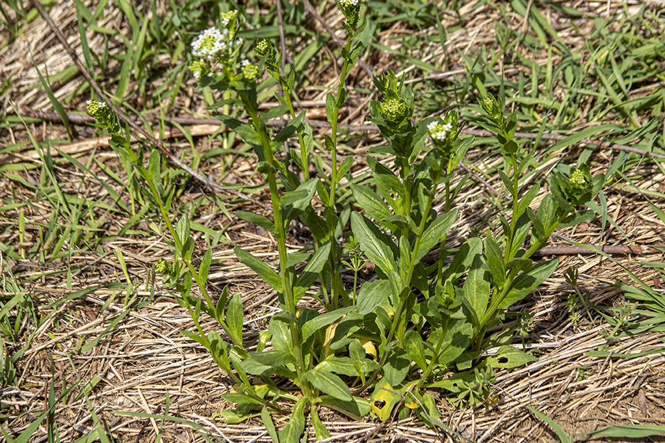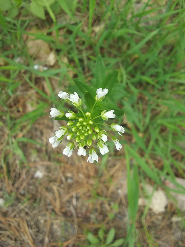 Shepherd’s purse (Capsella bursa-pastoris) has seed pods that are triangular, about ¼″ long at maturity, and are not notched. |