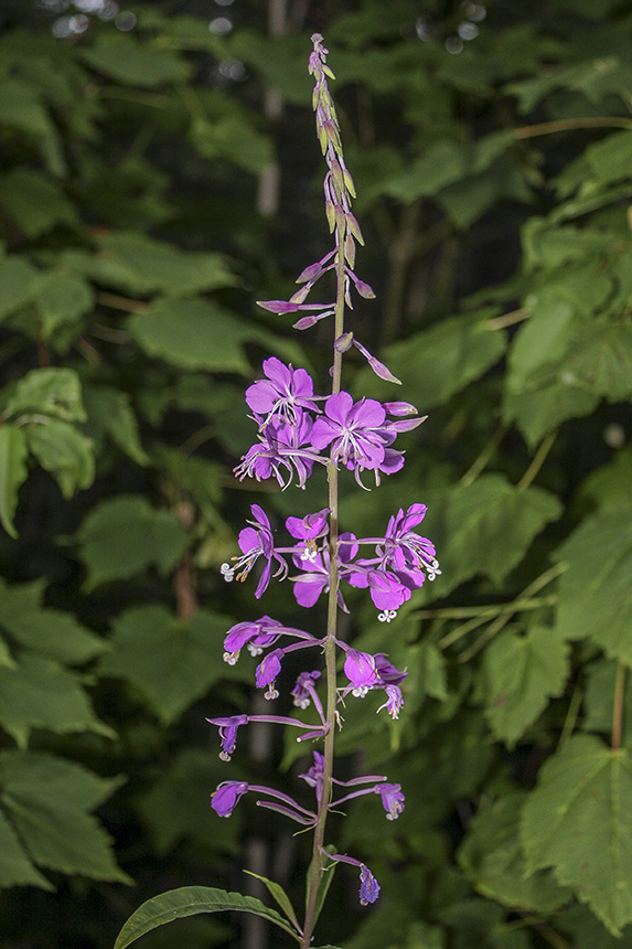 Fireweed (ssp. angustifolium) is an erect, perennial, 8″ to 52″ tall forb that rises usually on a single aerial stem from a rhizome-like underground stem and fibrous roots. It often forms large colonies. The stems are erect, usually unbranched, and round or somewhat angular in cross section. They are leafy; hairless or nearly hairless below the inflorescence; and green, sometimes becoming reddish near the top in strong sunlight. The leaves are alternate, numerous, and crowded. They are stalkless or nearly stalkless, narrowly lance-shaped or linear lance-shaped, 2¾″ to 5½″ long, and ¼″ to ½″ wide. The leaf blades are broadly angled or almost rounded at the base and taper to a point at the tip. The upper and lower surfaces are hairless, even on the midvein. There is a prominent midvein and 10 to 25 lateral veins that run into a single submarginal vein. The submarginal vein is distinct but the lateral veins often are not. The margins are untoothed or obscurely untoothed. The inflorescence is a 3″ to 8″ long, unbranched cluster (raceme) of up to 15 or more stalked flowers at the end of the stem. The flowers nod at the end of a long, magenta-colored stalk when in bud. They are spreading to almost erect when in bloom. Each flower is ¾″ to 1½″ in diameter. There are 4 sepals, 4 petals, 8 stamens and 1 style. The sepals are spreading, narrowly lance-shaped, ¼″ to ⅝″ long, and similar in color but darker than the petals. The petals are pink to magenta, rarely white. They are ⅜″ to ⅝″ long and ⅛″ to ⅜″ wide. They are narrowed at the base and broad near the tip. The stamens have long white filaments and dark magenta anthers. The style has a 4-lobed stigma. The fruit is a straight, cylinder-shaped, 1½″ to 3″ long capsule with many seeds. |