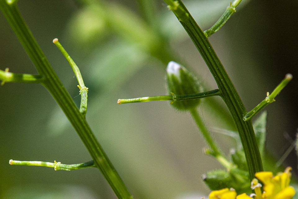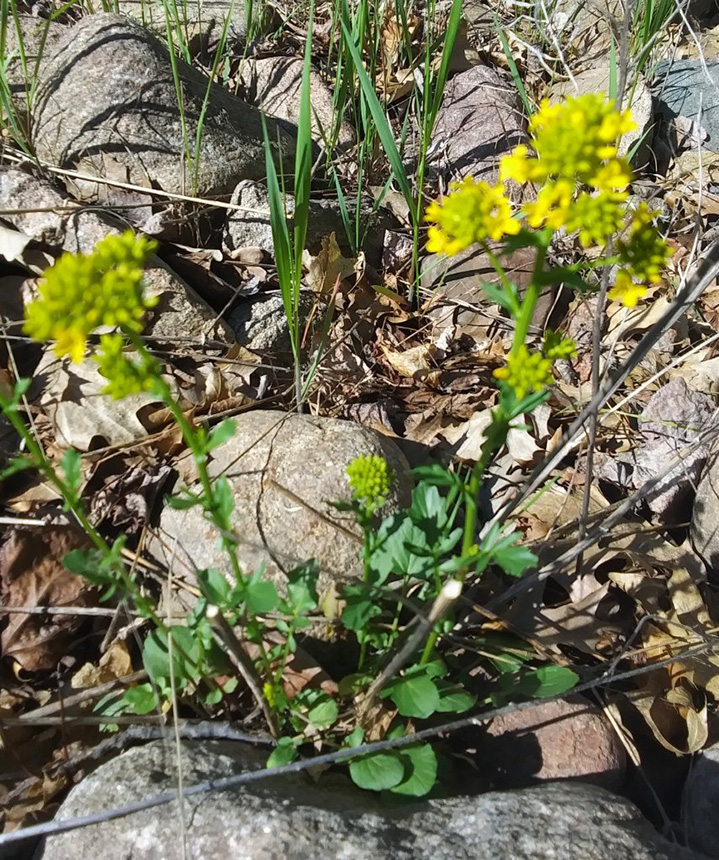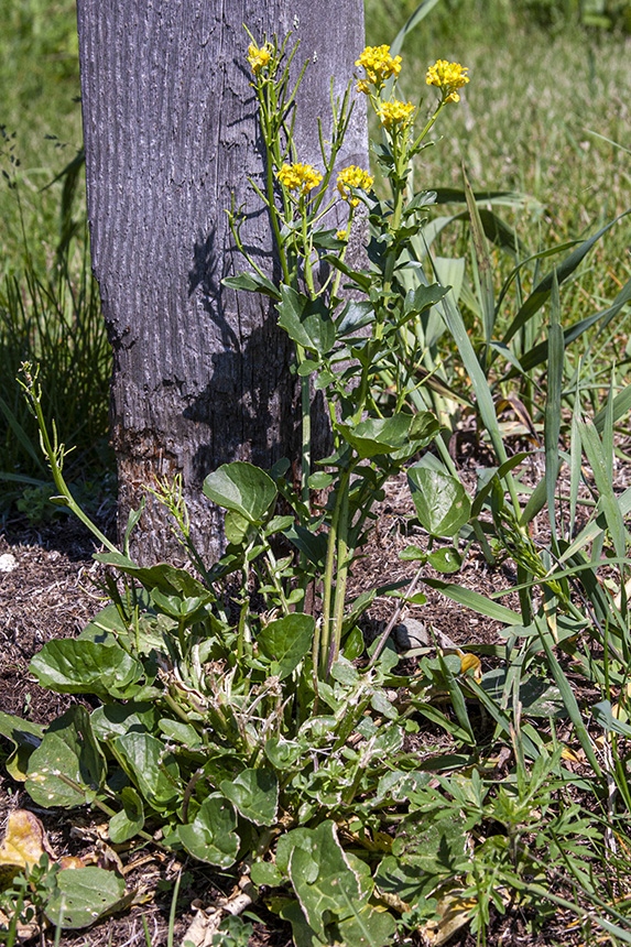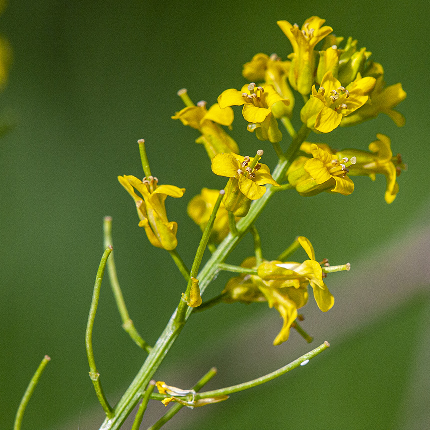 Garden yellowrocket, also known as yellow rocket, or in the UK as winter cress, is an exotic, 8″ to 32″ tall, erect, biennial or short-lived perennial forb that rises from a stout taproot. In it’s first year it forms a rosette of basal leaves up to 1′ across. In the second year it produces one or more flowering stalks. This is one of the first flowers to bloom in the spring. It blooms a second time in late fall. The stems are erect, angled, and usually unbranched below the inflorescence. They are usually hairless but are sometimes sparsely covered near the base with unbranched, nonglandular hairs. The leaves are alternate, dark green, hairless, and shiny on the upper surface. Basal leaves are up to 6″ long and 2″ wide and are attached to the stem with a ¾″ to 3″ long leaf stalk. They are divided into 1 to 4 pairs of small lateral lobes and a large terminal lobe. The lateral lobes are oblong, two to four times longer than broad with nearly straight sides or egg-shaped and attached at the narrow end. The terminal lobe is considerably larger, egg-shaped or nearly circular. The margins are wavy or bluntly toothed. Lower stem leaves resemble the basal leaves but are progressively smaller as they ascend the stem. A pair of ear-like basal lobes clasp the main stem. Upper stem leaves are egg-shaped or nearly circular and may be lobed, toothed, or entire. The margins are strongly wavy or bluntly toothed. They attach to the main stem without a stalk and sometimes clasp the stem at the base. They are not covered with a whitish, waxy coating (glaucous). The inflorescence is a terminal, branched, elongated, crowded cluster. The flowers have four yellow petals, are ½″ wide, and are stalked. The fruit is an ascending or spreading, ½″ to 1½″ long, narrow, curved pod that is roundish in cross-section. The fruits develop below the inflorescence. |