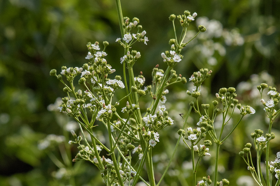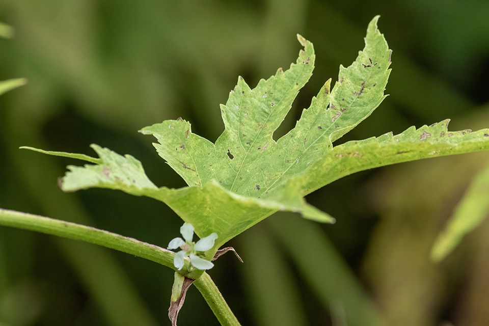 Glade mallow is a large, robust, herbaceous plant. It occurs in the United States in the Great Lakes region, and there are a few scattered occurrences in the northeast. It is sometimes cultivated as a garden ornamental. It is uncommon to rare throughout its range. It is rare in Minnesota. It is found in meadows, thickets, woodlands, and flood plains, and on stream banks, river banks, railroad banks, and roadsides. It grows under partial to full sun or in shade, in wet to moist, rich, loamy or silt-loamy soil. Glade mallow is an erect, perennial forb that rises on one to several stems from a large, deep taproot and from creeping rhizomes. It can be 40″ to 120″ (1 to 3 m) tall, but in Minnesota it is usually no more than 79″ (2 m) in height. It sometimes forms colonies. The stems are erect, round, and unbranched below the inflorescence. They are often coated with a whitish, waxy bloom (glaucous). They may be hairless, but they are usually sparsely covered with branched, star-like (stellate) hairs or unbranched (simple) hairs. The leaves are alternate and small to very large, 2″ to 20″ (5 to 50 cm) long, and 2¾″ to 25½″ (7 to 65 cm) wide. The lowest leaves are very large, and they are on very long leaf stalks (petioles) that can be up to 47″ (1.2 m) in length. The leaves get progressively smaller and on shorter petioles as they ascend the stem. Petioles on middle and upper leaves are usually shorter than the leaf blades. At the base of each petiole there is a pair of leaf-like appendages (stipules). The stipules are linear and about ¼″ (7 mm) long, and they are persistent. The leaf blades are kidney-shaped to circular in outline. They are deeply palmately divided into usually 5 to 9 lobes, sometimes 11 lobes. On lower and middle leaves, the lobes are narrowly angled with straight sides along the tip. On upper leaves, they are concave along the tip. On all leaves, the sinus between the lobes is at an angle less than 90°. The upper leaf surface is green to dark green and mostly hairless. The lower surface is paler, and it may be hairless or sparsely covered with stellate or simple hairs. The margins are coarsely toothed. The inflorescence is one or more branched clusters (panicles) at the end of each stem. At the base of each branch in the inflorescence there is a small, less than 3″ (75 mm) long, leaf-like bract. Each cluster is about 2″ (5 cm) long and wide and has numerous small flowers. Plants are dioecious, with male and female flowers borne on separate plants. Each male flower is ½″ to ¾″ (15 to 20 mm) in diameter. It has 5 sepals, 5 petals, and 16 to 20 stamens. The sepals are light green and hairless. They are fused together at the base into a short, tube-like calyx, then separated at the tip into 5 broad teeth. The lobes are 1⁄32″ to 1⁄16″ (1.5 to 2.0 mm) long, shorter than the tube. The petals are 3⁄16″ to ⅜″ (2 to 10 mm) long, white, and widely spreading. The stalks of the stamens are fused at the base into a narrow white column, then separated at the tip into short white filaments. The anthers are tan to pink. Each female flower has 8 to 10 styles, each with a stigma in the inner side. The stamen tube is very short and there is a ring of stalkless anthers at the top. The female flower is otherwise similar to the male flower. The fruit is a dry compound fruit (schizocarp) that splits at maturity into 6 to 10 sections (mericarps). Each mericarp is ⅛″ to 3 ⁄16″ (4 to 5 mm) long, erect, and kidney shaped, and each contains a single seed. |