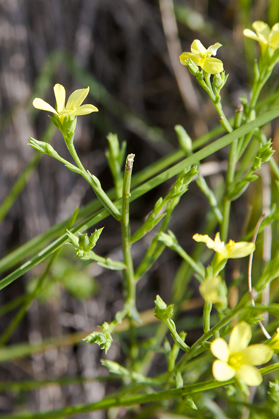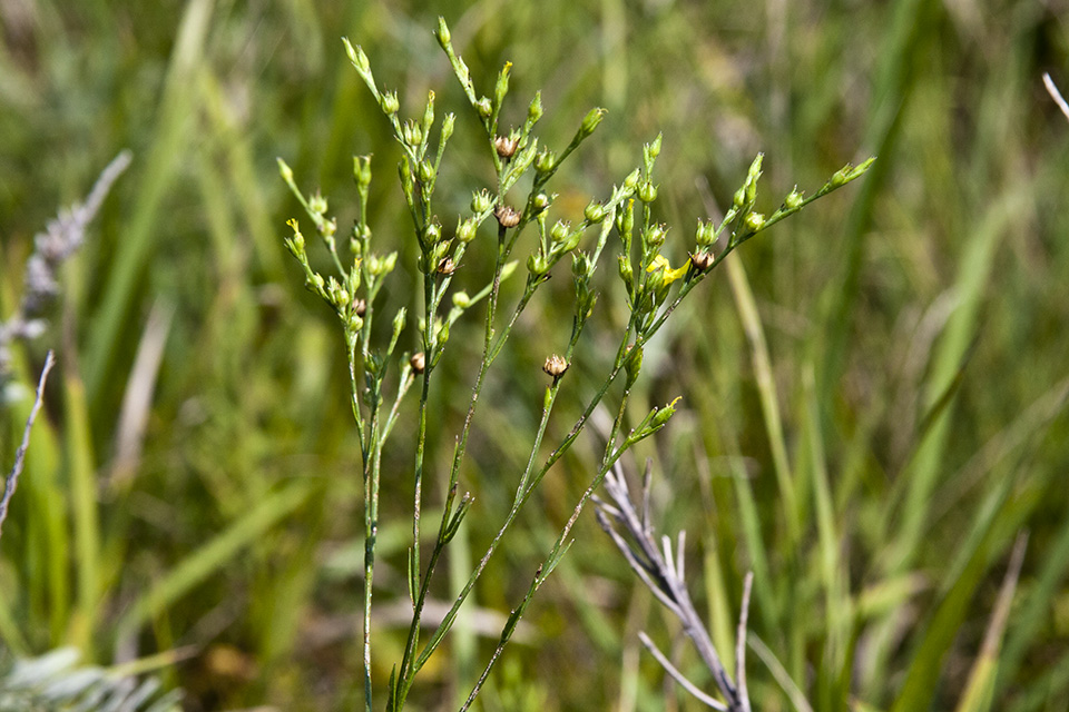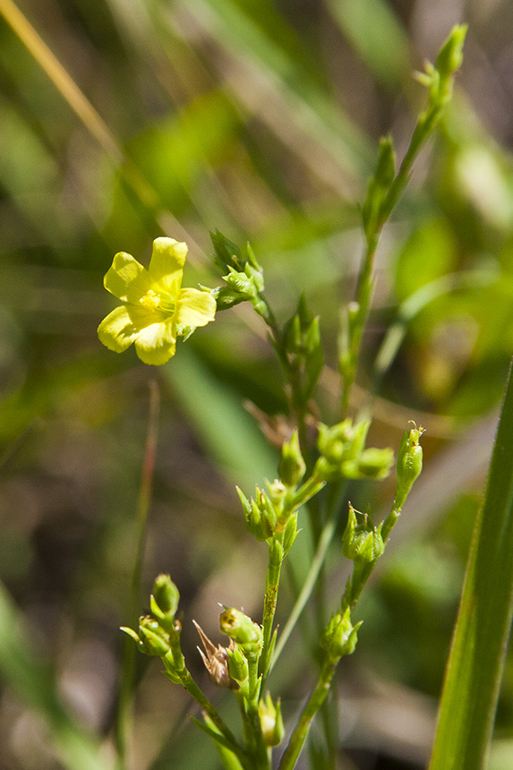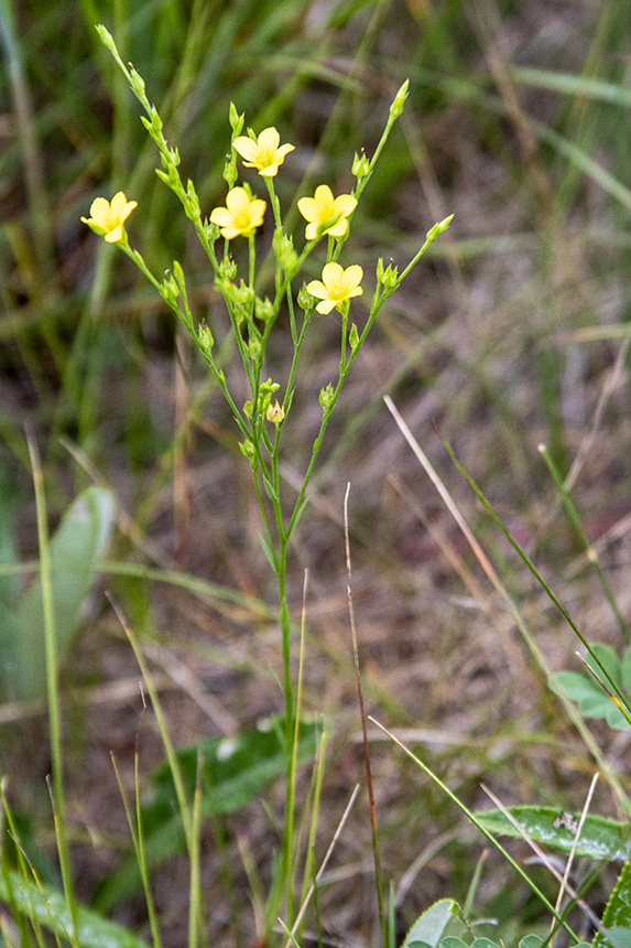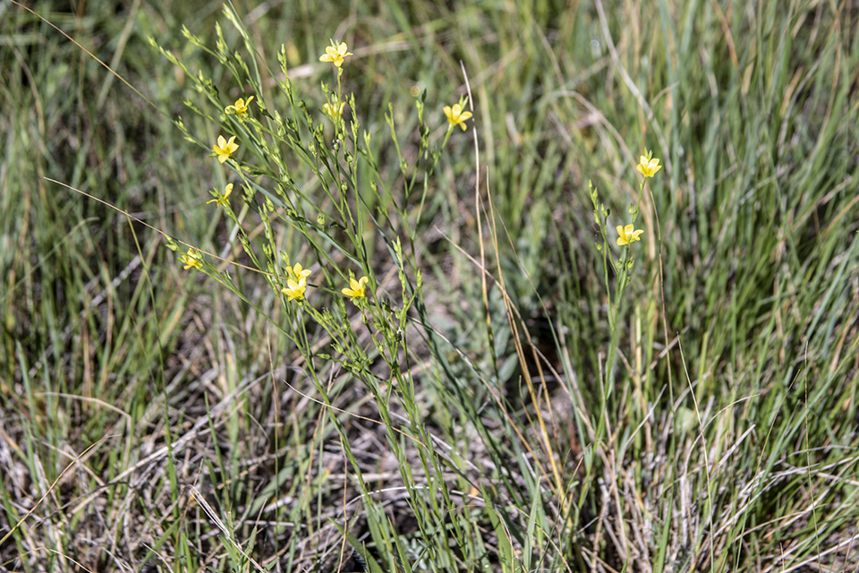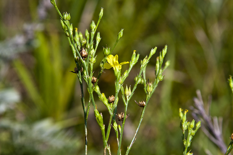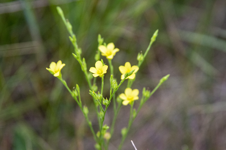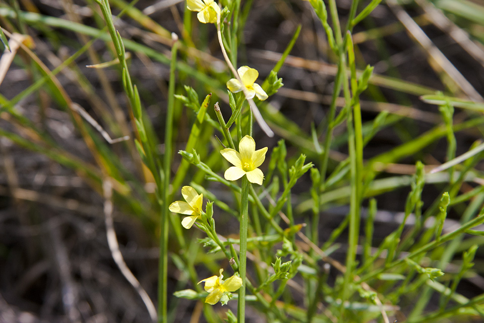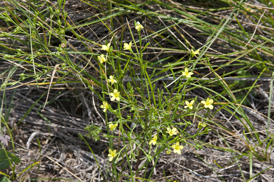 Grooved yellow flax can reach 32″ but is usually much shorter. There is a pair of glands, looking like tiny black dots, at the base of each leaf. The flowers are entirely yellow and small, no more than ½″ in diameter. |