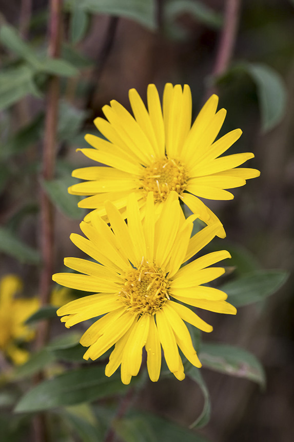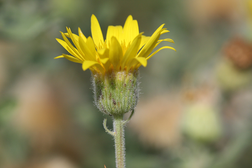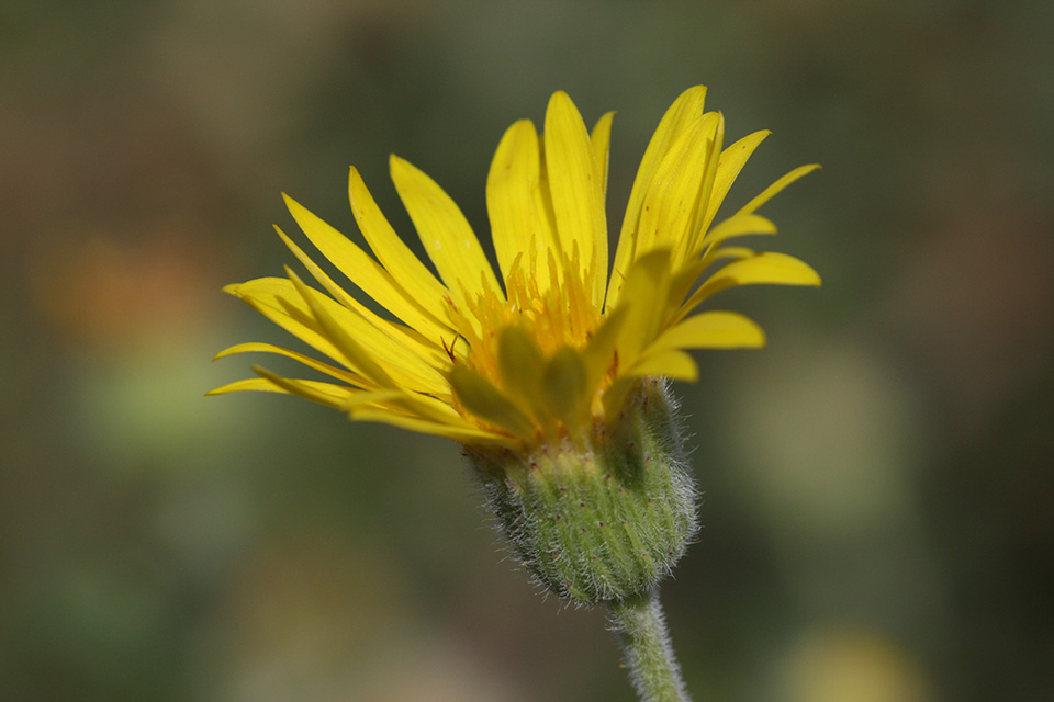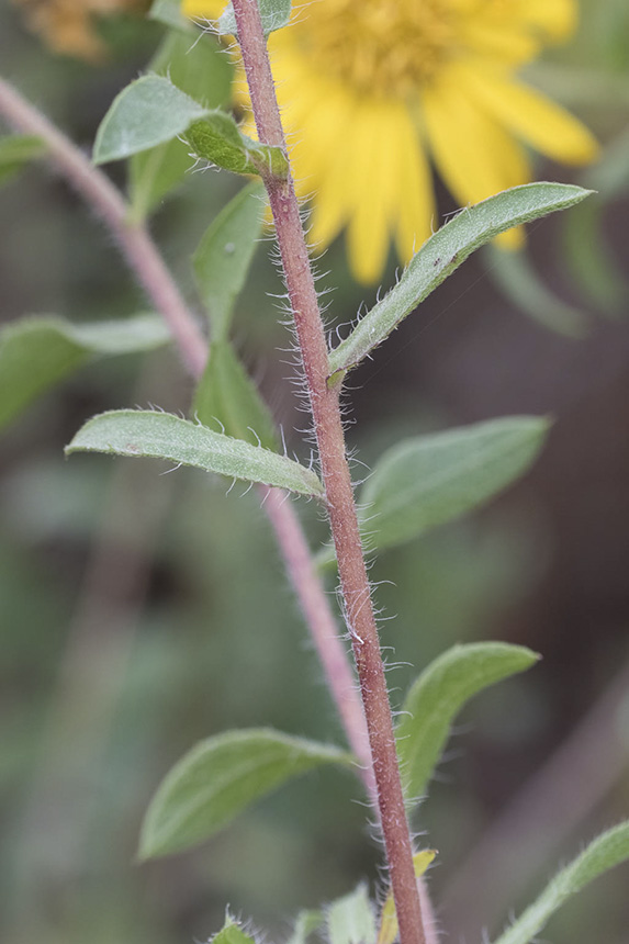 Hairy false goldenaster rises on 1 to 50 or more stems. It has a deep taproot that allows it to survive dry periods. The stems can be 2″ to 27½″ (5 to 70 cm) long, but they are usually not more than 16″ (40 cm) long. They can be erect, curving up from the base (ascending), or lying on the ground with just the tips ascending (decumbent). They may be sparsely to densely covered with stiff hairs. The hairs may be long or short, appressed to the stem or ascending. There may be a sparse or dense covering of gland-tipped hairs, or no gland-tipped hairs. The leaves are alternate and are not crowded. Lower leaf blades are inversely lance shaped, upper blades are usually lance shaped or inversely lance shaped to oblong. The pubescence of the leaf surfaces is as variable as that of the stems. The inflorescence is a few to many stalked yellow flowers at the end of each stem. |