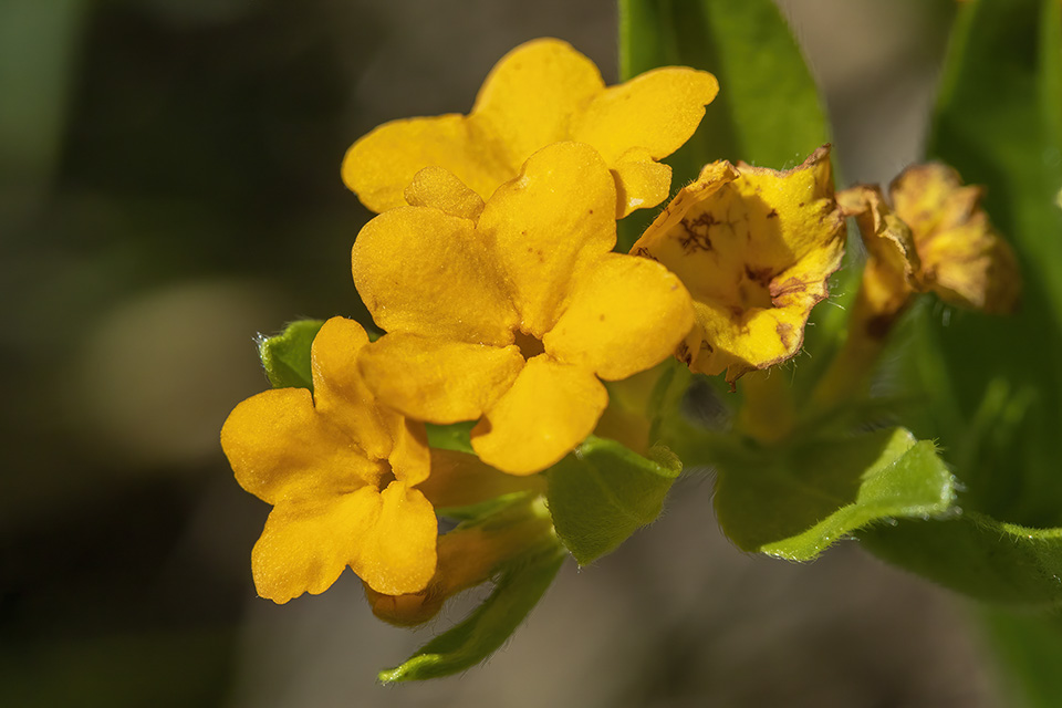 Hairy puccoon has larger petals that are slightly but noticeably lighter in color and have longer floral tubes.