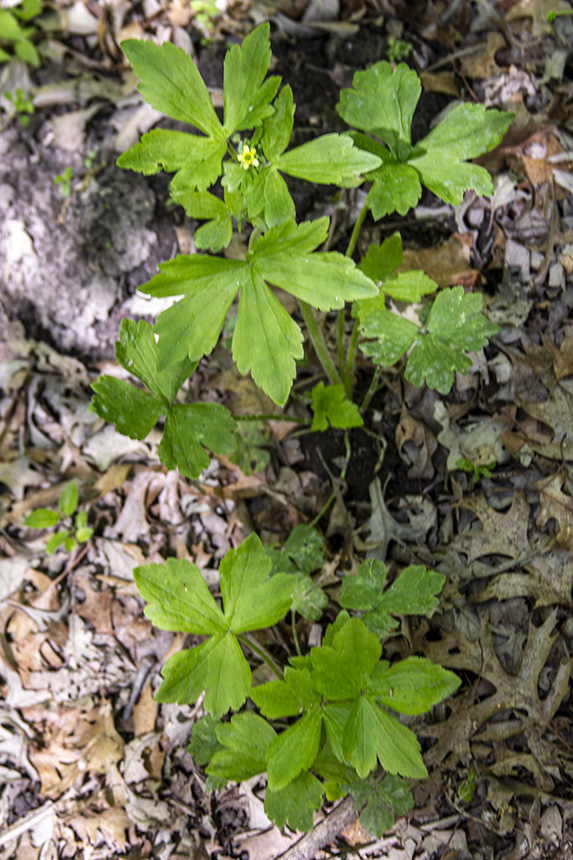Hooked buttercup is a common, easily identified, woodland spring wildflower. It occurs in the United States from Maine to South Carolina west to Minnesota and Oklahoma, and in adjacent Canadian provinces. It is found in wet to moderately moist or sometimes dry woodlands, in woodland openings and trails, on banks of rivers and streams, and in swamps and fens. It grows in rich organic soil under light to medium shade. It produces small flowers that are not showy from May to June. It is poisonous when eaten and causes contact dermatitis when handled. Hooked buttercup is a 8″ to 27½″ (20 to 70 cm) tall, erect, perennial forb that rises on one or more stems from fleshy roots and a thickened, corm-like base. The roots are never tuberous. The stems are round, few-branched, and erect or curving upward from the base (ascending). They do not root at the lower nodes. They are moderately to densely covered with long, fine, spreading hairs. Basal leaves are on hairy, up to 6″ (15 cm) long leaf stalks (petioles) that partially surround (sheath) the stem at the base. The leaf blade is egg-shaped to kidney-shaped in outline, shallowly to deeply heart-shaped at the base, ¾″ to 3″ (2.0 to 7.5 cm) long, and 1 3⁄16″ to 4½″ (3.0 to 11.6 cm) wide. It is moderately to deeply cut into three lobes. The lobes are oblong to diamond-shaped (rhombic) and may be again cut into two or three lobes. They may be blunt or sharply pointed at the tip. The margins may be scalloped or have fine but blunt teeth. The upper and lower surfaces are moderately covered with long soft hairs. Stem leaves are few. They are similar to basal leaves but they get smaller, less divided, and on shorter petioles as they ascend the stem. Uppermost leaves are often stalkless or almost stalkless. The inflorescence is a few solitary flowers, each rising on a hairy stalk (pedicel) from an upper leaf axil at the end of the stem. Each flower is ¼″ to ⅓″ wide. There are 5 outer floral leaves (sepals), 5 petals, and numerous stamens. At the center of the flower there is a dense cluster of green pistils. The sepals are light green, ⅛″ to ¼″ (3 to 6 mm) long, and 1⁄16″ to ⅛″ (1.5 to 2.5 mm) wide. They are strongly bent backward at or near the base and hang downward when the flower is in bloom. They are more or less flat, with no transverse fold. The petals are pale yellow and about as long or slightly shorter than the sepals. They are lance-shaped to broadly oblong-lance-shaped, ⅛″ to 3⁄16″ (3 to 5 mm) long, and 1⁄32″ to 1⁄16″ (1 to 2 mm) wide. The stamens form a ring around the base of the cluster of pistils. The stamen stalks (filaments) are whitish, hairless, and 1⁄16″ to ⅛″ (2 to 3 mm) long. The anthers are yellow. Each pistil has a single tiny style. The fruit is a dry seed capsule (achene) replacing each pistil. As the achenes begin to develop, the petals and sepals fall to the ground, leaving an egg-shaped to more or less globe-shaped, 3⁄16″ to ¼″ (5 to 7 mm) long seed head. Each achene is shaped like a thickened lentil, 1⁄16″ (1.6 to 2.2 mm) long and 1⁄32″ to 1⁄16″ (1.4 to 1.8 mm) wide. The outer margin is strongly ridged (keeled). The faces appear smooth, but strong magnification reveals a minutely pitted surface. There is a slender extension (beak) at the end of the achene. The beak is lance-shaped and strongly curved, appearing hooked. This is the feature that gives the plant its common name. |