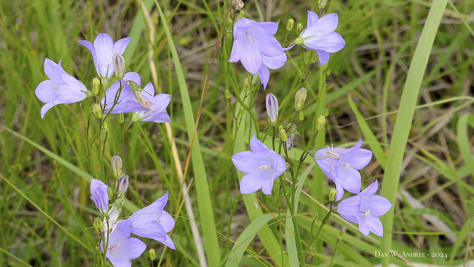 Intermediate bellflower is a 4″ to 20″ tall, erect, perennial forb that rises from shallow roots and a slender rhizome. The stems are slender and erect to ascending. They do not recline on adjacent plants. They are unbranched except just below the inflorescence. They may be hairless or have inconspicuous longitudinal lines of hairs. When broken, the stem exudes a milky sap. Basal leaves are, broadly egg-shaped to nearly circular, 3 ⁄16″ to ⅜″ long, and 3 ⁄16″ to 5 ⁄16″ wide. They are on slender, ¾″ to 1¼″ long leaf stalks. They are shallowly heart-shaped, rounded, or broadly angled at the base and rounded or angled to a sharp point at the tip. The upper and lower surfaces are hairless. The margins are untoothed or have a few blunt teeth. Basal leaves are often absent at flowering time. The species name, rotundifolia, refers to the shape of the basal leaves. Stem leaves are alternate and ascending or spreading. Lower stem leaves are long-stalked, narrowly elliptic to narrowly inversely egg-shaped, and 1¼″ to 2⅜″ long. The upper and lower surfaces are hairless. The margins are untoothed. The leaves become progressively smaller, narrower, and shorter stalked as they ascend the stem. Upper stem leaves are stalkless and narrowly lance-shaped to linear. The inflorescence is a nodding, usually unbranched cluster (raceme) of 3 to 8 flowers at the end of the stem. The flowers are bell-shaped and ¾″ to 1¼″ long. There are 5 green sepals (calyx), fused at their base into a 1 ⁄16″ to ⅛″ long tube, then separated into 5 linear, ⅛″ to 3 ⁄16″ long lobes. The calyx lobes are widely spreading at maturity. There are 5 light blue to blue petals (corolla), fused at their base for about half of their length into a ¼″ to ⅜″ long tube, then separated into 5 lance-shaped, ⅛″ long lobes. The lobes of the corolla are much shorter than the tube and are flared outward. The calyx and corolla are each radially symmetrical so that if bisected vertically on any plane each half would be identical. There are 5 stamens that do not protrude from the corolla tube. There is a single violet style that ends in a stigma with 3 lobes. The style protrudes from the corolla tube but is not as long as the petals. The fruit is a nearly spherical, 3-chambered capsule containing many seeds. The capsule is ⅛″ to 3 ⁄16″ long, 1 ⁄16″ to ⅛″ in diameter. |