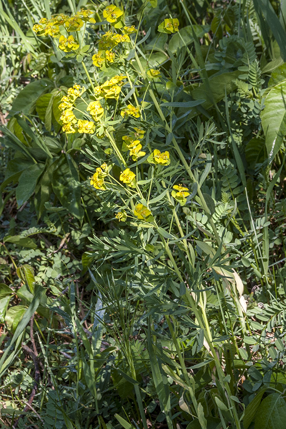 Introduced rhizomatous perennial, stems erect 30-80 cm tall, glabrous leaves and stems with milky latex, unisexual simple flowers congested into a cup-like structure, which is rimmed with nectary-producing callus tissue, ovary distinctly three-lobed, common to sites with a history of intense or regular disturbance, including pastures, grasslands, open understory, meadows, riparian corridors. |