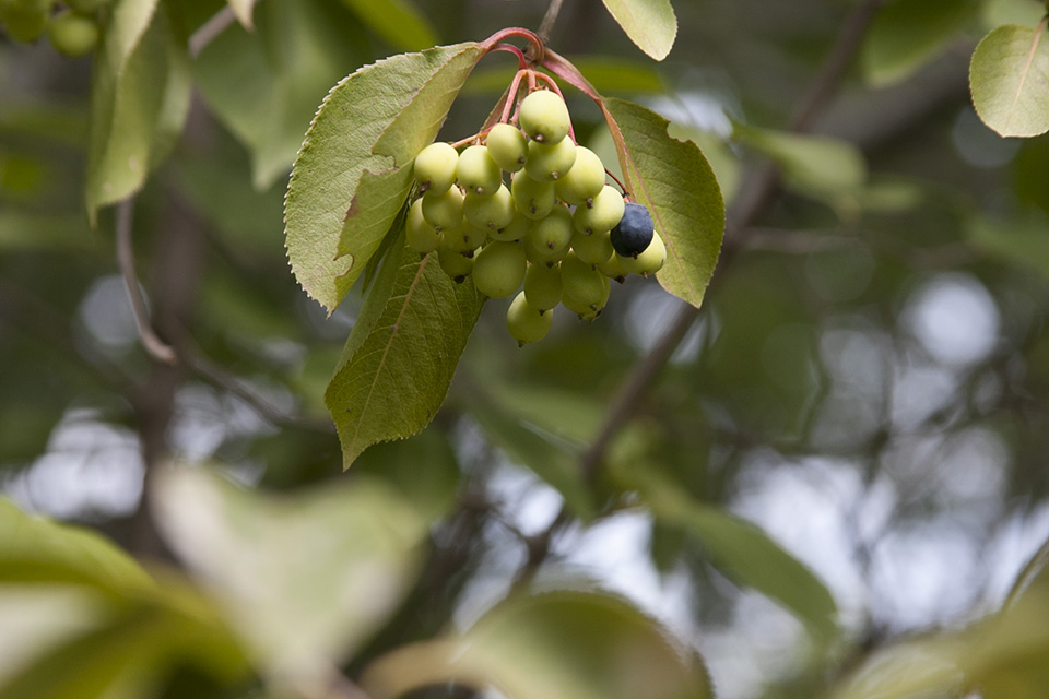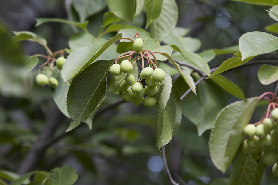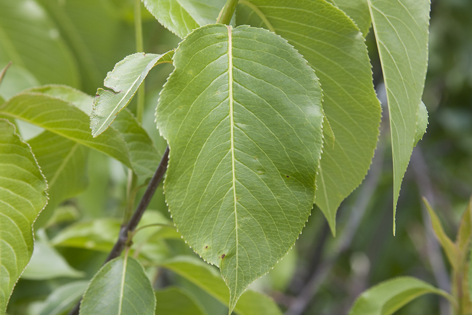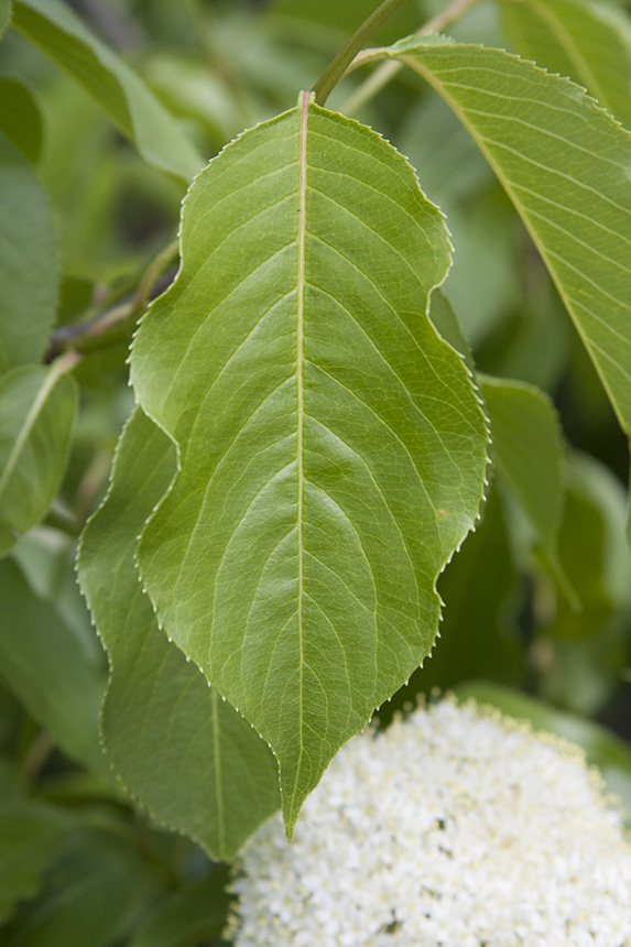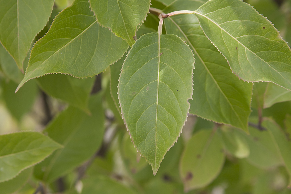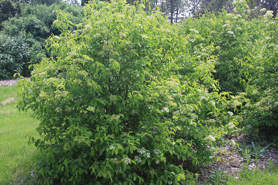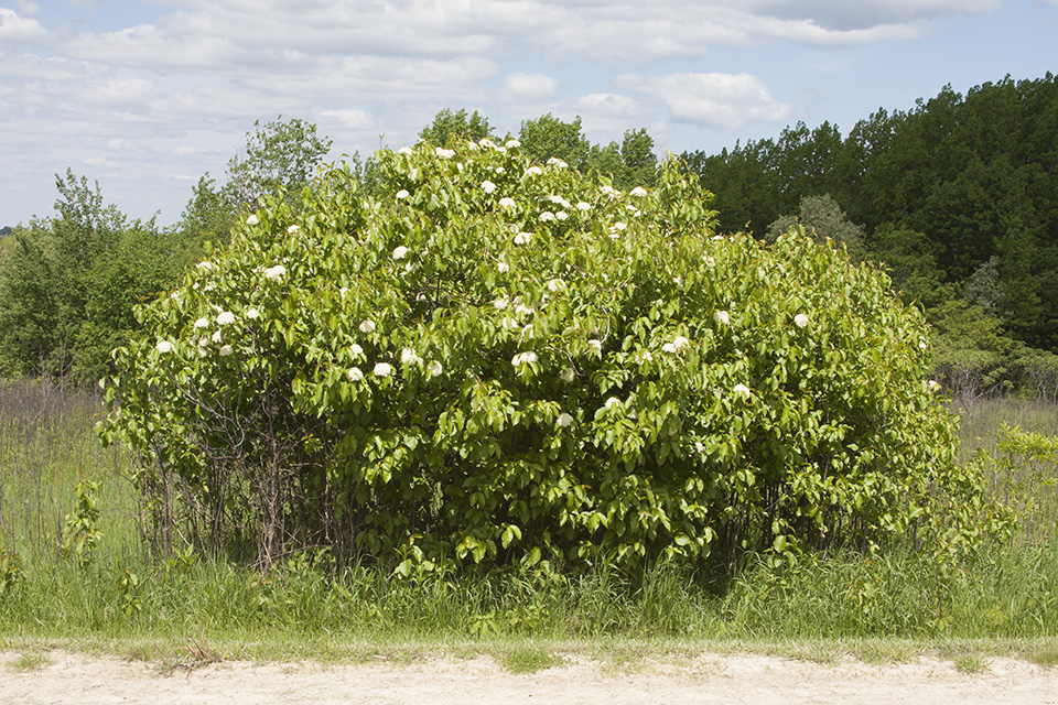 Nannyberry is a moderate growing, short lived, tall shrub with multiple stems or a short tree with a single stem. It rises from scattered, deep, anchoring roots and shallow, branched, fibrous, soil-binding roots. The roots have buds which may sprout and form above-ground stems (suckers). When conditions permit, it forms colonies which may become large and dense. The stems are slender and crooked. They may be up to 26′ tall and up to 6″ in diameter at breast height, but are usually no more than 20′ in height and 3″ in diameter. Twigs are slender, long, flexible, and round or somewhat six-sided. First-year twigs are pale green and covered with downy, rust-colored hairs at first, becoming gray or dull grayish-brown, smooth, and hairless. Second-year twigs are brown to reddish-brown or grayish brown, and may be somewhat covered with a whitish, waxy bloom (glaucous). The twigs have an unpleasant odor when bruised. The pith is white and solid. The leaf scars are narrow, crescent-shaped, and slightly raised. Each leaf scar has three bundle scars. The terminal bud is brownish-gray, hairless, ¾″ to 1¼″ long, oblong cone-shaped, and somewhat flattened, with a swollen, bulbous base and a long, tapered tip. It is covered by two sharply pointed, abutting but not overlapping, sharply-pointed scales. Lateral buds are about half as long, are not swollen at the base, and are often curved. The bark is grayish-brown and smooth at first, becoming rough and shallowly furrowed with irregular, scaly plates on older stems. When broken, the bark has a skunk-like odor. The leaves are opposite, undivided (simple), and deciduous. They are attached to the twig on a ⅝″ to 1¼″ long leaf stalk (petiole). The petiole is channeled on the upper (ventral) side and and has conspicuous wavy wings. It is moderately to densely covered with microscopic, red, star-shaped hairs when young, becoming hairless or nearly hairless at maturity. There are no projecting glands near the attachment of the leaf blade. There are no leaf-like appendages (stipules) at the base of the petiole. The leaf blades are relatively thin, broadly egg-shaped to elliptical or broadly elliptical, 2″ to 4″ long, and 1⅜″ to 2⅜″ wide. They are rounded or broadly tapered at the base and taper to a short, sharp point at the tip with concave sides along the tip. They are pinnately veined. The lateral veins are evenly spaced, curve toward the tip, and form a network with adjacent veins without reaching the margin. The upper surface is dark green or yellowish-green and glossy, with scattered, microscopic, red, star-shaped hairs when young, becoming hairless at maturity. The lower surface is pale green with tiny, dark brown dots. The margins have more than 25 fine, sharp, forward-pointing teeth on each side. The leaves turn red or reddish-purple in the fall. The inflorescence is a dense, rounded, shallowly convex, 2″ to 4″ in diameter, branched cluster (cyme) at the ends of the current-year branches. The cymes have usually 3 to 5, sometimes up to 7, main branches emanating from the tip of the branch. Each cyme has a few hundred to several hundred small flowers. The flowers are ⅛″ to 5⁄16″ in diameter. There are five sepals, five petals, five stamens, and no style. The sepals are green, fused for most of their length into a minute cup (calyx), and separated at the tip into five minute, egg-shaped lobes. The petals are pale yellow to creamy white, egg-shaped to elliptical, and 1 ⁄16″ to ⅛″ long. The stamens have white filaments and bright yellow anthers. They are ⅛″ to 3 ⁄16″ long, longer than the petals. There is a three-lobed, stalkless stigma on a short disk (stylopodium) at the top of the ovary. The flowers on the margin are fertile and are similar in appearance and size to the other flowers. The flowers are not fragrant. They appear in mid-May to early June. The fruit is an edible, juicy, berry-like, ellipse-shaped to nearly spherical, somewhat flattened, 5 ⁄16″ to ⅝″ long drupe. It contains one seed. It is green initially, becoming bluish-black and glaucous at maturity. The calyx and stigma persist in fruit, forming a dried tip at the end (apex) of the drupe. The pedicels turn red as the fruit matures. The fruit ripens in late August to late September, often remaining on the plant through the winter. |