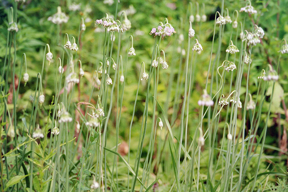 Nodding wild onion is an erect perennial forb rising from 2 to 5, sometimes more, clustered bulbs. The bulbs are ⅜″ to 1⅛″ tall, ⅓″ to ⅔″ wide, elongate, slender, and cone-shaped. They are encased in a brownish or grayish membranous coating. They gradually taper to the stem. Three to five basal leaves arise near together at the soil surface forming a basal rosette. They are shorter than the stem. They are 4″ to 18″ long, about ⅛″ wide, linear, flat, soft, and solid, with a small ridge running the length of the blade. They sheath the stem near the soil surface. They remain after the flowers are fully formed. A single, leafless, flowering stem (scape) rises from the center of the rosette of leaves. When in bud, the scape bends downward (nods) at the top, and the umbel faces toward the ground. The scape is permanently nodding. By the time the flowers are mature the umbel faces upward on the still bent scape. The inflorescence is a single umbrella-like flowering cluster at the top of the scape. The cluster is shaped like half of a sphere. It has 8 to 35 flowers and no bulblets. There are two bracts at the base of the cluster that soon fall off. When in bud, the cluster bends downward (nods) at the top of the scape. When the flowers are fully mature the scape is still (permanently) nodding, but the flowers may become erect or semi-erect. The flowers are ¼″ wide and bell-shaped. They are composed of 6 white to pink tepals (3 petals and 3 sepals that are similar in appearance). They are on ¼″ to 1″ long flower stalks, the inner ones on shorter stalks, the outer ones on longer stalks, like an umbrella. There is no floral fragrance, but the bulb and foliage have an onion-like scent. The fruit is a seed capsule. The pedicels become stouter with the fruit, growing longer and bending abruptly upright from near the point of attachment. |