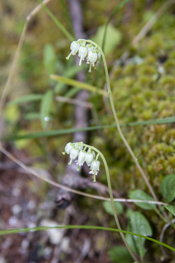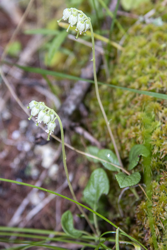 One-sided wintergreen is a common but often overlooked plant in northern and mountain forests. It is native, widespread, and common across the Northern Hemisphere. In the United States it is common in New England, the Upper Midwest, and the West, absent from the South and Lower Midwest. In Minnesota it is very common in the Arrowhead and north-central regions, less common in the Metro and southeast regions, and absent from the southwest. It is found in deciduous, coniferous, and mixed forests, and in bogs. It grows in dry to moist soil under full to partial shade. In Minnesota it is found mostly on moist, mossy forest floors. It obtains about half of its nutrients from the underground fungal (mycorrhizal) network that assists other plants in absorbing nutrients from the soil. One-sided wintergreen is an erect, perennial, long-lived forb that rises on a single stem from a forking, underground, horizontal stem (rhizome). It can be 4¾″ to 13″ (12 to 33 cm) tall, but is usually less than 7⅞″ (20 cm) in height. The leaves are evergreen, ¾″ to 1⅞″ (20 to 47 mm) long, and ¼″ to 1⅛″ (7 to 28 mm) wide. They are firm and sometimes have an almost leathery texture. They appear basal, rising from the rhizome, but are actually clustered on the stem near the base. They appear to be in whorls, emerging from the same point on the stem, but are actually alternate or in pseudowhorls, very closely spaced but emerging at separate points on the stem. There are usually 2 to 4 pseudowhorls, sometimes just 1. Each leaf is on a hairless, ⅛″ to ¾″ (4 to 20 mm) long stem (petiole). The petiole is channeled above. The leaf blade may be egg-shaped or broadly egg-shaped, widest near the base; elliptic, widest at the middle; or nearly circular. It is rounded to narrowly angled at both ends. The upper surface is shiny, green, and hairless. The lower surface is dull, light green, and hairless. The margins are flat, rarely somewhat rolled toward the underside. It may be untoothed or have fine rounded teeth. It does not have sharp teeth. The stem may be erect or lay on the ground with just the tip curved upward (decumbent). There is no visible point where the short stem ends and the long inflorescence stalk (peduncle) begins. Both are hairless and green or slightly reddish. The stem is unbranched, leafy, and smooth to the touch. The peduncle is unbranched and leafless but usually has minute, pimple-like protuberances (papilla), especially dense toward the top. There are usually 2 to 5 small modified leaves (bracts) on the peduncle, but these may be absent. The bracts are narrowly or broadly lance-shaped, ⅛″ to ⅜″ (3 to 9 mm) long, and 1⁄32″ to 1⁄16″ (1 to 2 mm) wide. The inflorescence is a ¾″ to 2″ (2 to 5 cm) long, unbranched cluster (raceme) of flowers at the end of the stem. There are usually 6 to 20 flowers but there may be as few a 2 or as many as 29. They hang downward from one side of the arcing tip of the peduncle. Each flower is ¼″ to ⅜″ long, bell-shaped, and as long or longer than wide. It hangs from a ⅛″ to ¼″ (3 to 7 mm) long flower stalk (pedicel). At the base of each pedicel, but not attached to the pedicel, is a scale-like, awl-shaped or more or less lance-shaped bract. The bract is about the same length as the pedicel. There are 5 outer floral leaves (sepals), 5 petals, and 10 stamens, and 1 style. The sepals are fused just at the base then broadly separated into 5 broadly triangular to egg-shaped lobes. They are green but may have white or pinkish margins. The petals are white, 3⁄16″ to ¼″ (4.5 to 6.0 mm) long, and ⅛″ (3 to 4 mm) wide. The stamens protrude just beyond the petals. The style is green, stout, and long, protruding far beyond the petals. The fruit is a flattened globe-shaped, ⅛″ to 3 ⁄16″ (3 to 5 mm) long, ⅛″ to ¼″ (4 to 6 mm) in diameter capsule. When in fruit the peduncle straightens and elongates and the pedicels straighten so that the capsules are stiffly held more or less parallel to the ground. The infructescence (all of the fruits) is up to 3⅛″ (8.5 cm) long. |