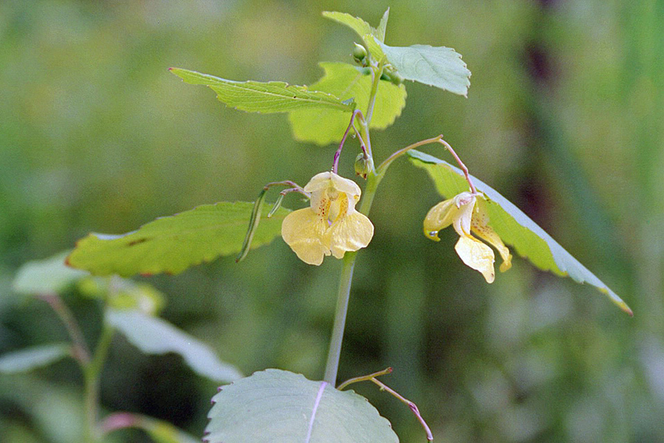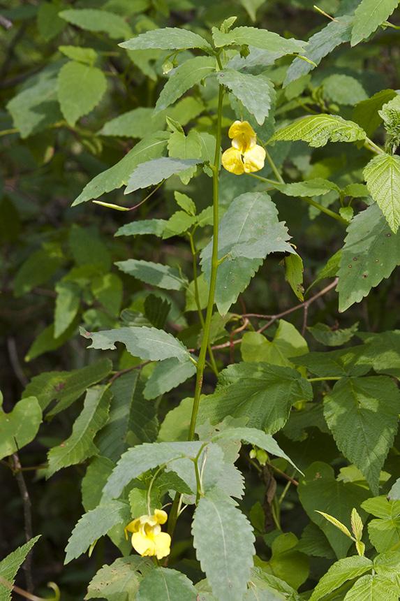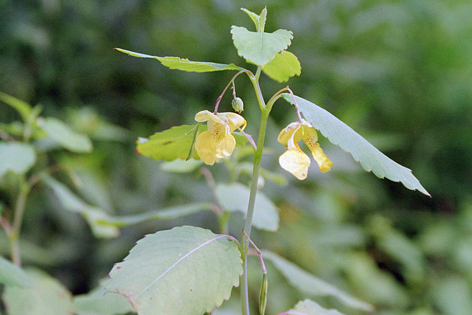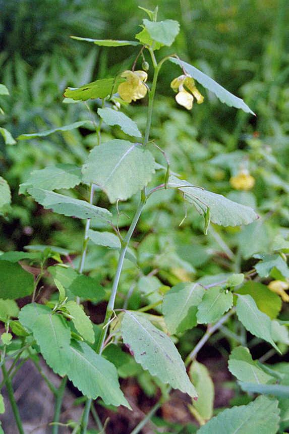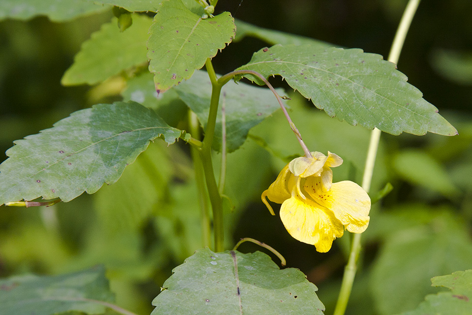 Pale touch-me-not is a 2′ to 6′ tall, erect, annual forb that rises from a shallow, branching taproot. It often forms colonies The stems are erect, hairless, branched above the middle, light green, and translucent. They are succulent, hollow, and easily broken. They are often covered with a whitish, waxy coating (glaucous). The leaves are alternate, egg-shaped or elliptic, and thin. They are 1″ to 4″ long and up to 2″ wide, less than 3 times longer than wide. They are on leaf stalks up to 2″ long, the stalk usually shorter than the blade. The upper surface is blue-green or glaucous and hairless. The lower surface is hairless. The margins have rounded, forward-pointing teeth. The teeth are tipped with a short, sharp, whitish, abrupt point. The leaves on flowering branches are usually more than 3⅛″ long. The inflorescence is a widely-spreading cluster of 1 to 3 flowers rising from the upper leaf axils. The flowers are held horizontally on ¾″ to 1⅛″ long, drooping stalks. The flowers are 1″ to 1½″ long. There are 3 petal-like sepals and 5 petals. The upper 2 sepals are yellow, small, and located behind the upper lip. The lower sepal is yellow. It is modified to form a bowl-shaped tube ending in a narrow nectar spur. The bowl-shaped portion of the sepal is about as long as it is wide. The spur is ⅛″ to ¼″ long, hairless, and is held at a right angle to the flower body, pointing downward. The petals are yellow and often dotted with reddish-brown. One petal forms the upper lip. It is short and wide and curves upward. The four remaining petals are fused in pairs to form two lobed, lateral petals. The lobes of these petals spread outwards forming a pair of landing pads for pollinating insects. Near the upper lip are 5 stamens fused together forming a cap over the pistil. There is no floral scent. The fruit is a slender, hairless, 5-valved capsule about ¾″ long. When ripe it explodes if touched or jarred, releasing its seeds. |
