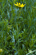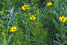 Prairie coreopsis is a 12″ to 48″ tall, erect, perennial forb that rises on usually one or more stems from a long, creeping rhizome. It sometimes forms dense colonies. The stems are erect, unbranched, and mostly hairless or sparsely hairy at the base of the leaves. They are green with light green vertical stripes. The leaves are opposite, broadly inversely egg-shaped in outline, 1⅛″ to 3⅛″ long, and stalkless or almost stalkless. They are distributed in 6 to 12 pairs along ⅔ or more of the stem. They are usually hairless but sometimes have a few hairs on the margin near the base. The leaf blades are usually divided into 3 lobes well above the base and have the shape of a turkey foot. The lobes are sometimes lobed again, resulting in 3 to 7 (rarely to 9) ultimate lobes. The lobes are narrowly oblong, ⅝″ to 1½″ long, and 1 ⁄16″ to usually ⅛″, sometimes ¼″, wide. Upper leaves are sometimes unlobed. The inflorescence is one to a few flower heads at the end of the stem and from upper leaf axils. The flower heads are 1½″ to 2½″ wide on stalks ⅜″ to 2″ long. The involucre is bell-shaped and is composed of 2 series of bracts, 8 inner bracts and 9 to 12 or more outer bractlets. The inner bracts are yellow-brown, oblong to nearly circular, ¼″ to ⅜″ long, ⅛″ to 3 ⁄16″ wide, and bent backward above the middle. The outer bracts are green, linear, ascending, and about ¼″ long and ⅛″. There are 8 to 10 ray florets and 60 to 80 disk florets. The ray florets are yellow, ⅝″ to 1″ long, and about ⅜″ wide. They are more or less rounded at the tip and may have 2 or 3 (sometimes 4) tiny teeth at the tip. The disk is ⅓″ to ½″ wide. The disk floret is a yellow, 5-lobed corolla tube with a branched style. There is no floral scent. The fruit is a dry seed capsule (achene) that does not have a tuft of hair (pappus) attached. |