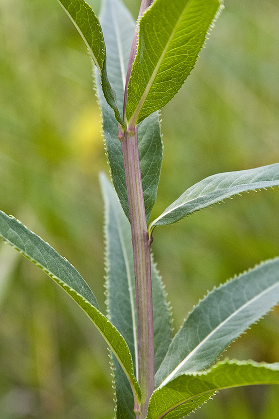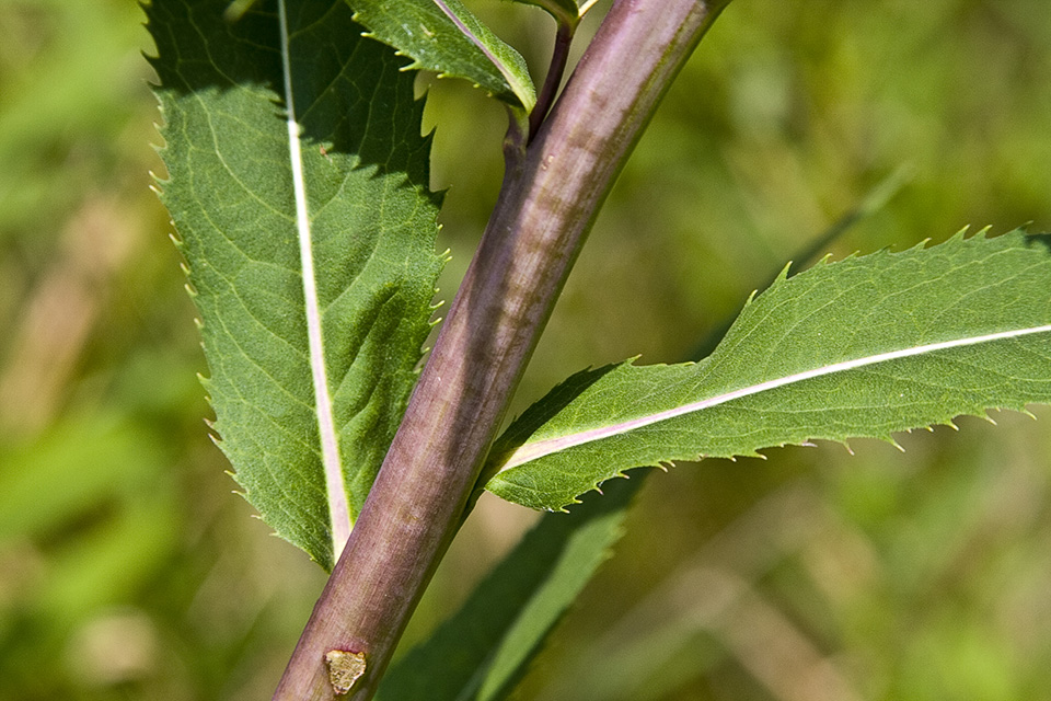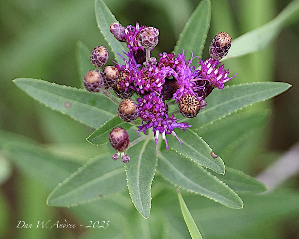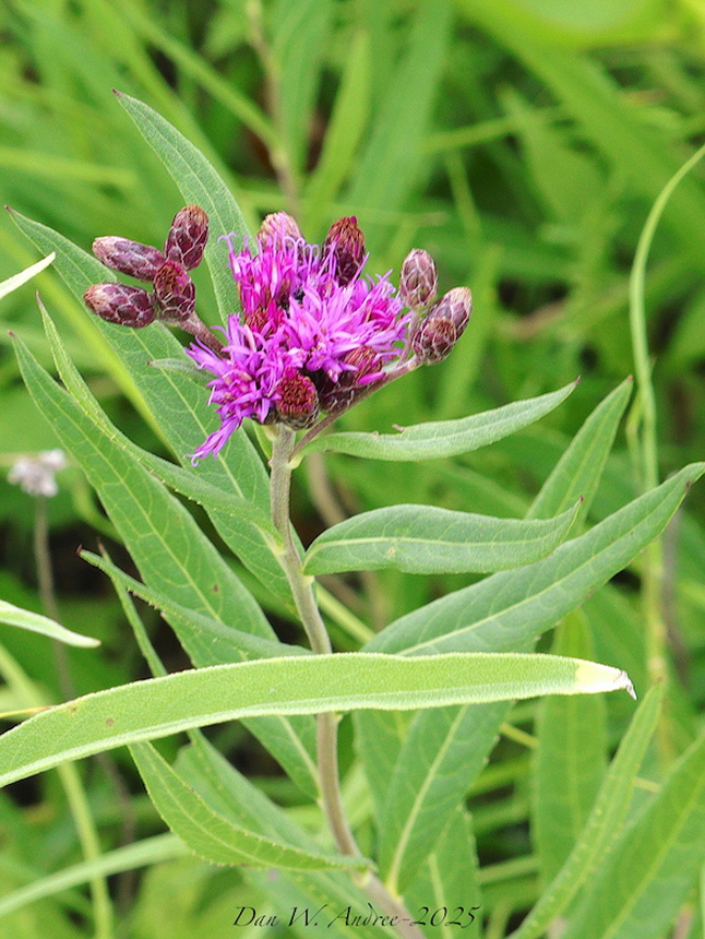 Prairie ironweed, also called smooth ironweed, is a 20″ to 55″ tall, erect, perennial forb that rises on a single stem or a clump of 2 or more stems from a stout, thickened rootstock. The stems are erect, round, light green or reddish-purple, and unbranched below the inflorescence. The are usually hairless but are sometimes minutely hairy near the top. The leaves are alternate, stalkless or on short leaf stalks, narrowly to broadly lance-shaped, 2″ to 7″ long, and ⅜″ to 1½″ wide. The leaf blades are tapered at the base and taper to a sharp point at the tip. The upper surface is green, smooth to the touch, and mostly hairless but may have fine short hairs near the margin. The lower surface is similar in color, hairless, and dotted with minute pitted glands. The glands appear as translucent dots when the leaf is held up to the sun or another light source. The margins are sharply toothed. The inflorescence is a dense, branched, 1½″ to 4″ wide, flat-topped cluster (cyme) of many flower heads at the end of the stem. The flower heads within the cyme are not grouped into secondary head-like clusters. The base of each flower head (involucre) is bell shaped, 3 ⁄16″ to ⅜″ long and ⅛″ to ¼″ high. The involucre is composed of 25 to 35 or more modified leaves (bracts) in 4 or 5 overlapping series. The involucral bracts (phyllaries) are ⅛″ to ¼″ long, and their tips are pressed closely to the involucre. They are green but usually tinged purplish along the midvein and toward the tip. They are mostly hairless on the back but sometimes have sparse, long, cobwebby hairs on the margins. The outer phyllaries are broad and scale-like. The inner ones are narrow. Each flower head has 10 to 26 disk florets and no ray florets. The disk florets are purple and ⅜″ to 7 ⁄16″ long. They are tube-shaped at the base then separated into 5 long, widely spreading lobes. The flowers have no noticeable scent. The fruit is a dry, brown, one-seeded, 1 ⁄16″ to ⅛″ long seed capsule (cypsela) with a modified calyx (pappus) is attached to one end. The pappus is in two series: an outer ring of 20 to 30 minute scales, and an inner tuft of 35 to 45 tan to brownish-purple, 3 ⁄16″ to ¼″ long hair-like bristles. |