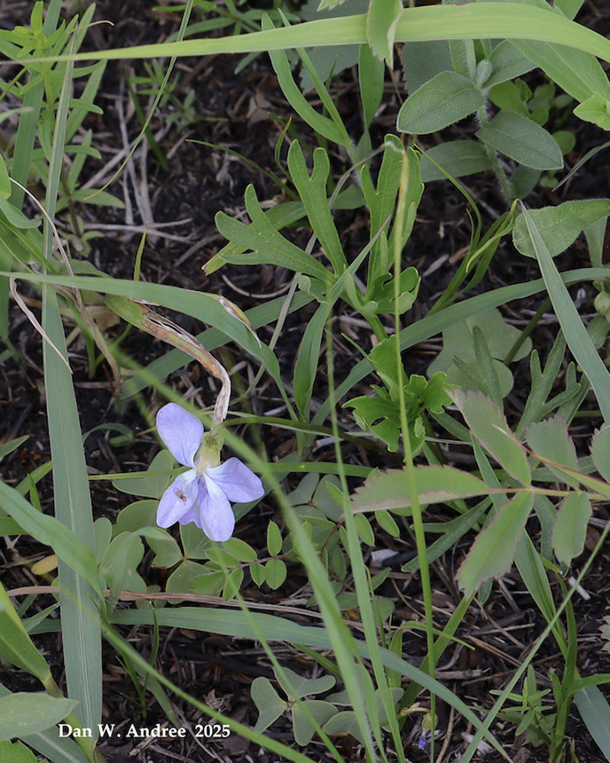 Prairie violet is a 3″ to 6″ tall, erect, perennial forb that rises from a short, slanted or erect caudex and fibrous roots. There is no central stem. The leaves are all basal and form a rosette. They are on stalks up to 1″ long. The leaf blades are 1″ to 3″ long and 1″ to 4″ wide. They are dissected almost to the base into usually 3 main divisions. Each division is again deeply cut into 2 to 4 linear segments, and the segments are often again lobed. Early leaves and later leaves are equally divided. The upper and lower surfaces may be moderately covered with spreading hairs or almost hairless. The margins are untoothed and have a fringe of hairs. One to several leafless flower stalks (scapes) rise from the rootstock at the middle of the rosette. The scape is erect, leafless, and hairless, and is topped with a single flower. It is abruptly curved downward near the top. The flowers are usually held above the early leaves but are often overtopped by later leaves. Two types of flowers are produced: open, cross-pollinated (chasmogamous) flowers; and closed, self-fertilizing (cleistogamous) flowers. Cross-pollinated flowers are ¾″ to 1 3 ⁄16″ wide and showy. There are 5 sepals, 5 petals, 5 stamens, and 1 style. The sepals are green and shorter than the petals. The petals are violet or pale violet and ¼″ to ¾″ long. The two upper petals are erect or bent backward. The three lower lobes are spreading, white at the base, and have a tuft of white hairs (beard) near the throat. The lowest lobe has conspicuous, dark purple veins near the throat and a hooked, rounded spur at the base. The 5 stamens are orange and have very short filaments. They do not protrude from the throat of the corolla and are concealed by the beards of the petals. The flowers are not fragrant. Self-pollinating flowers occur on shorter scapes that may be erect or lie flat on the ground. The fruit is an egg-shaped to ellipse-shaped, ¼″ to ⅓″ long, hairless, yellowish-brown capsule with many brown seeds. The capsule protrudes noticeably beyond the persistent sepals. |